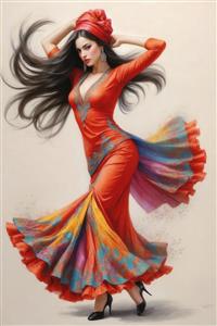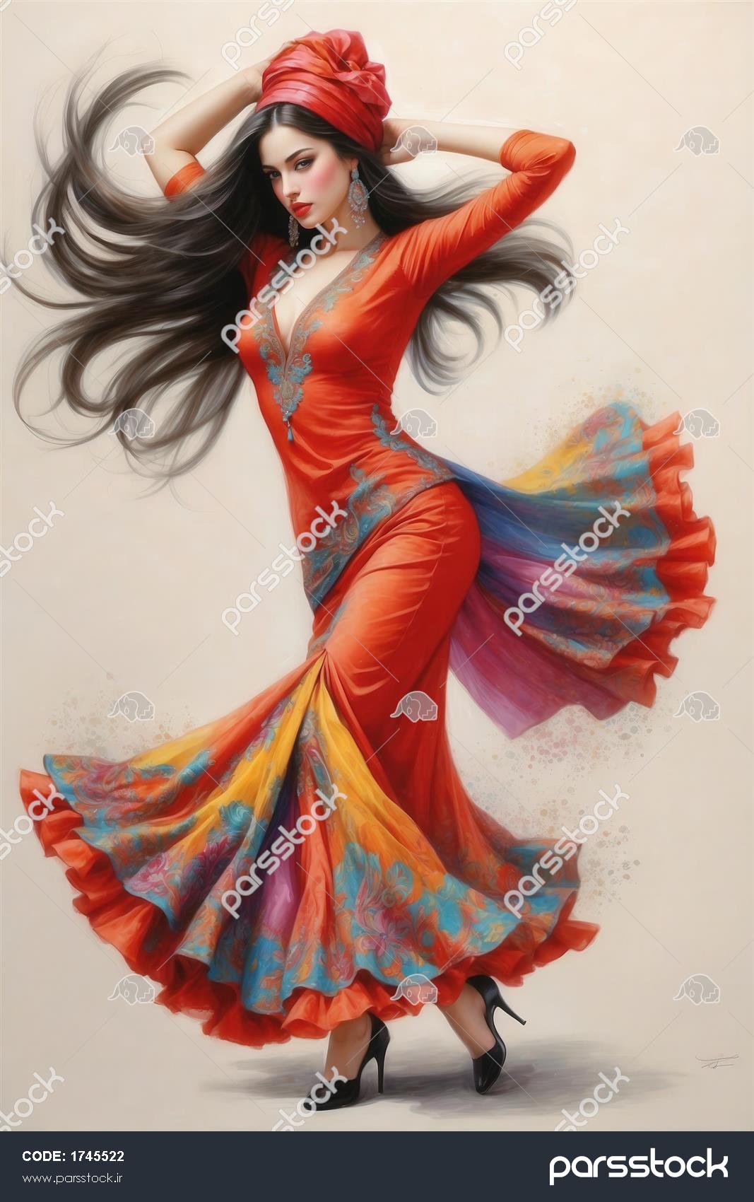 رقصنده فلامنکو با لباس قرمز و دامن پرچین رنگین‌کمان، مناسب چاپ تابلو دکوراتیو