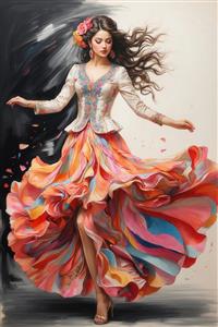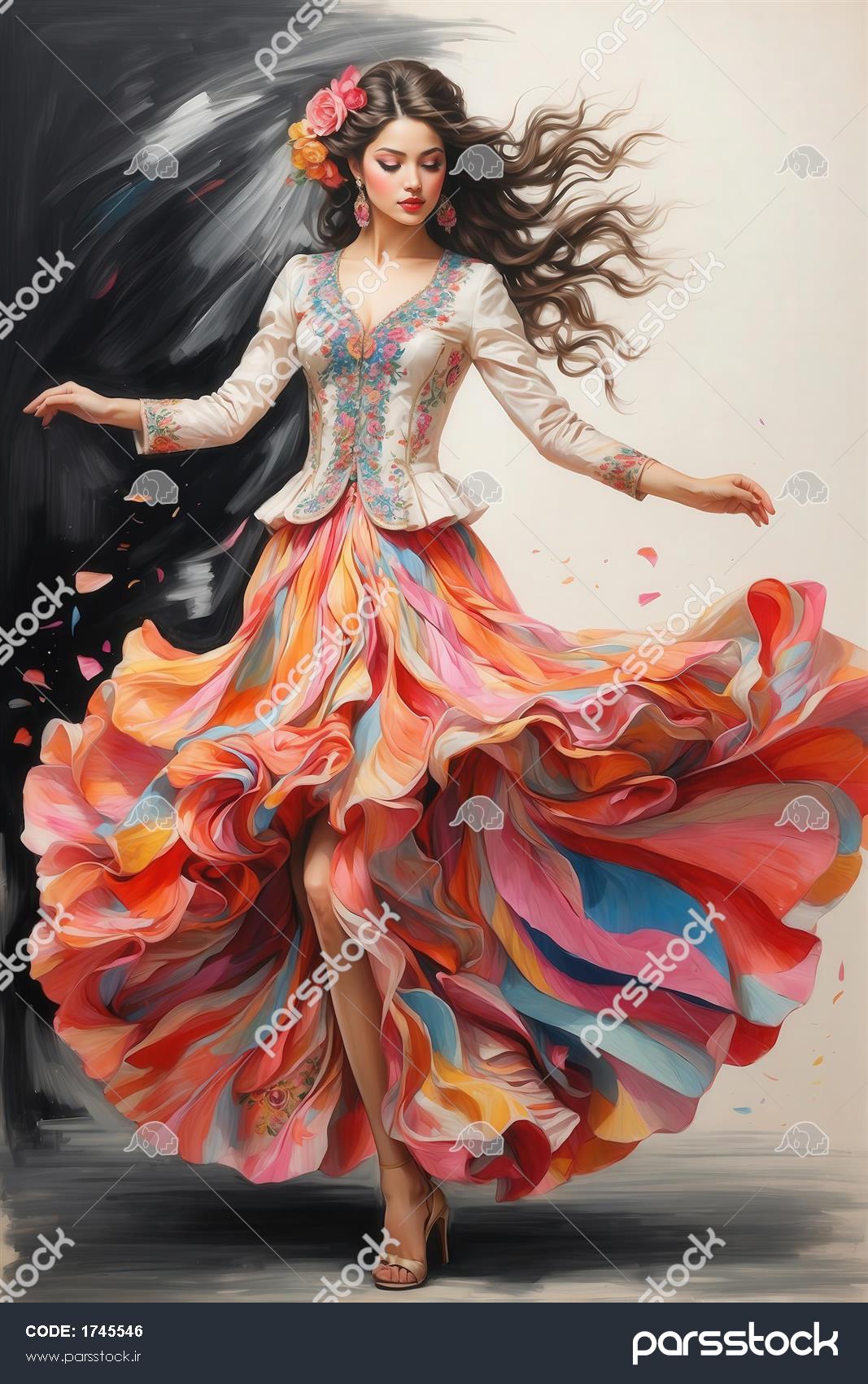 زنی در حال رقص با پیراهن لایه‌لایه شاد و گل‌های رز روی مو، بک‌گراند با کنتراست مشکی و سفید