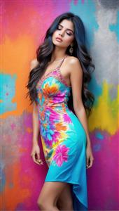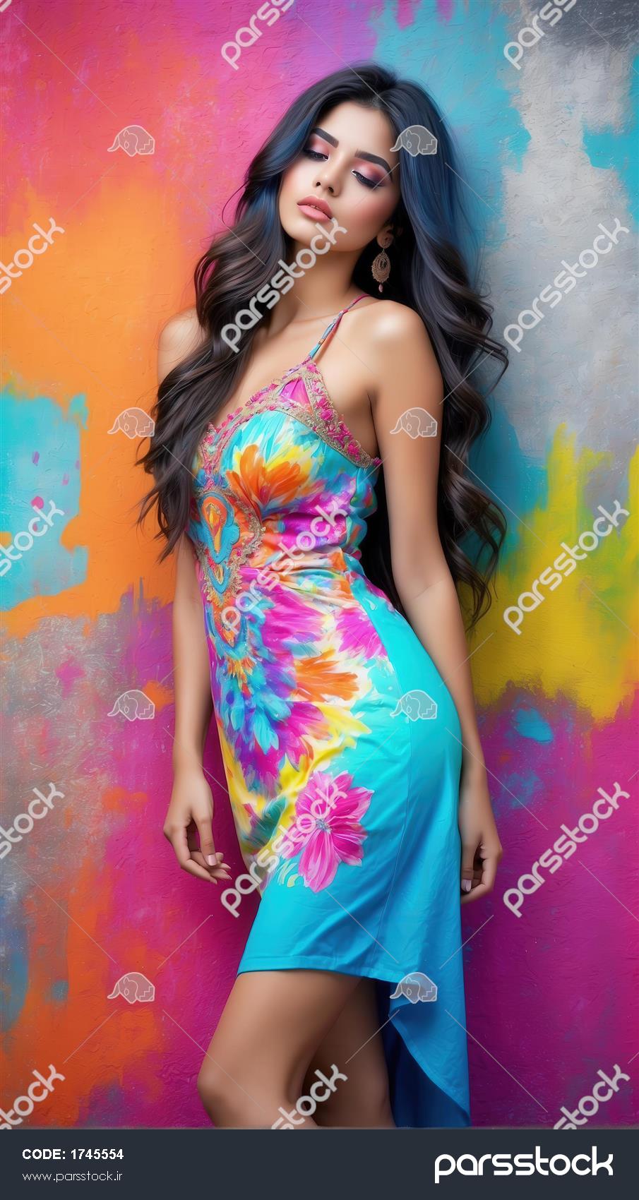 مدلینگ زیبا با لباس طرح‌دار نئون آبی در برابر دیوار گرافیتی رنگارنگ، استایل هیپی