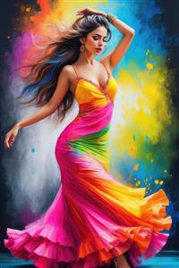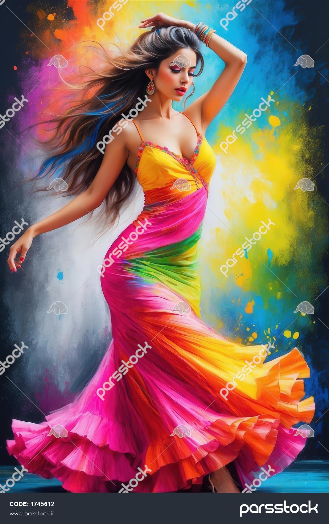 رقصنده زن با لباس پرچین رنگین‌کمانی و موهای پرتحرک (استایل فشن)