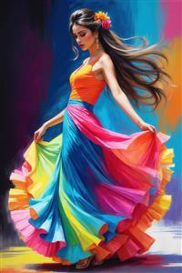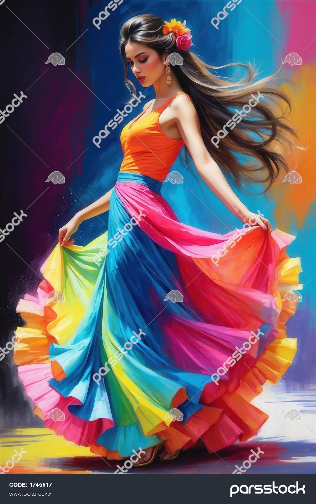 مدل زنانه با لباس نارنجی و دامن چندرنگ در استایل نقاشی آبرنگ