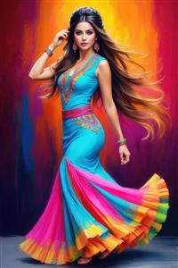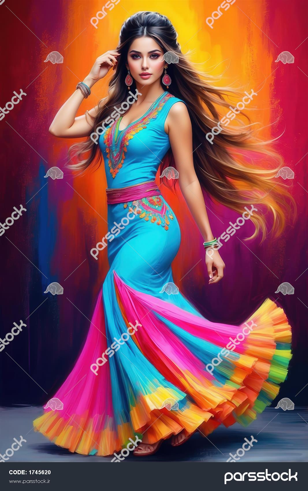 تصویر فشن زن با لباس بلند فیروزه‌ای و دامن پرچین رنگین‌کمان