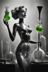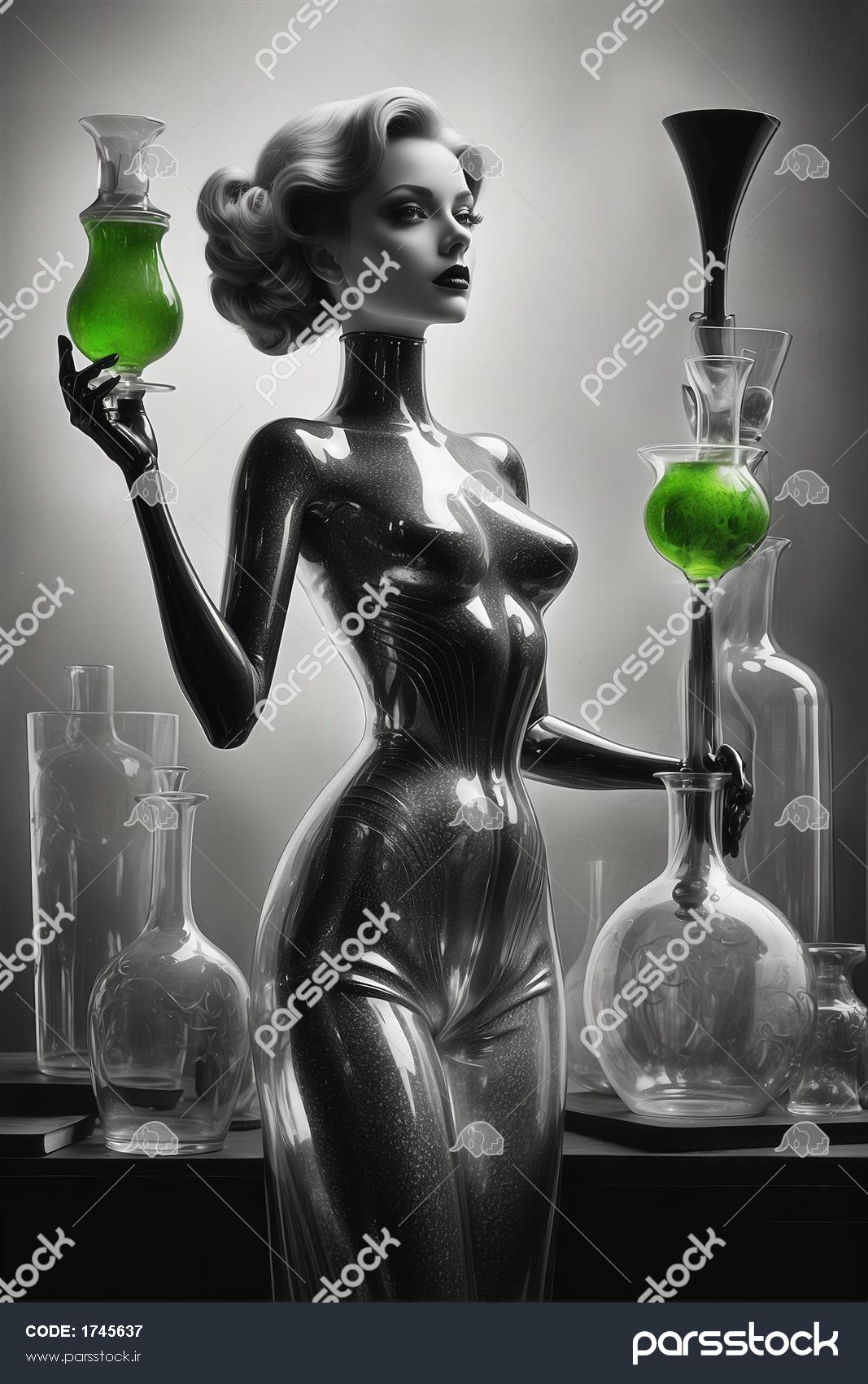 زن با لباس براق آزمایشگاهی در حال نگه‌داشتن معجون سبز (تصویر نوار)