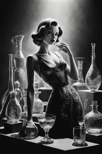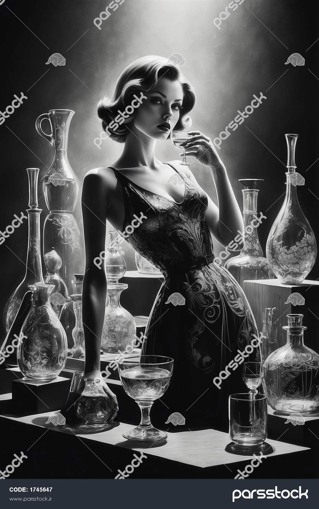 تصویر تمام‌قد زن با لباس شب و کلکسیون بطری‌های شیشه‌ای حکاکی شده