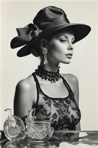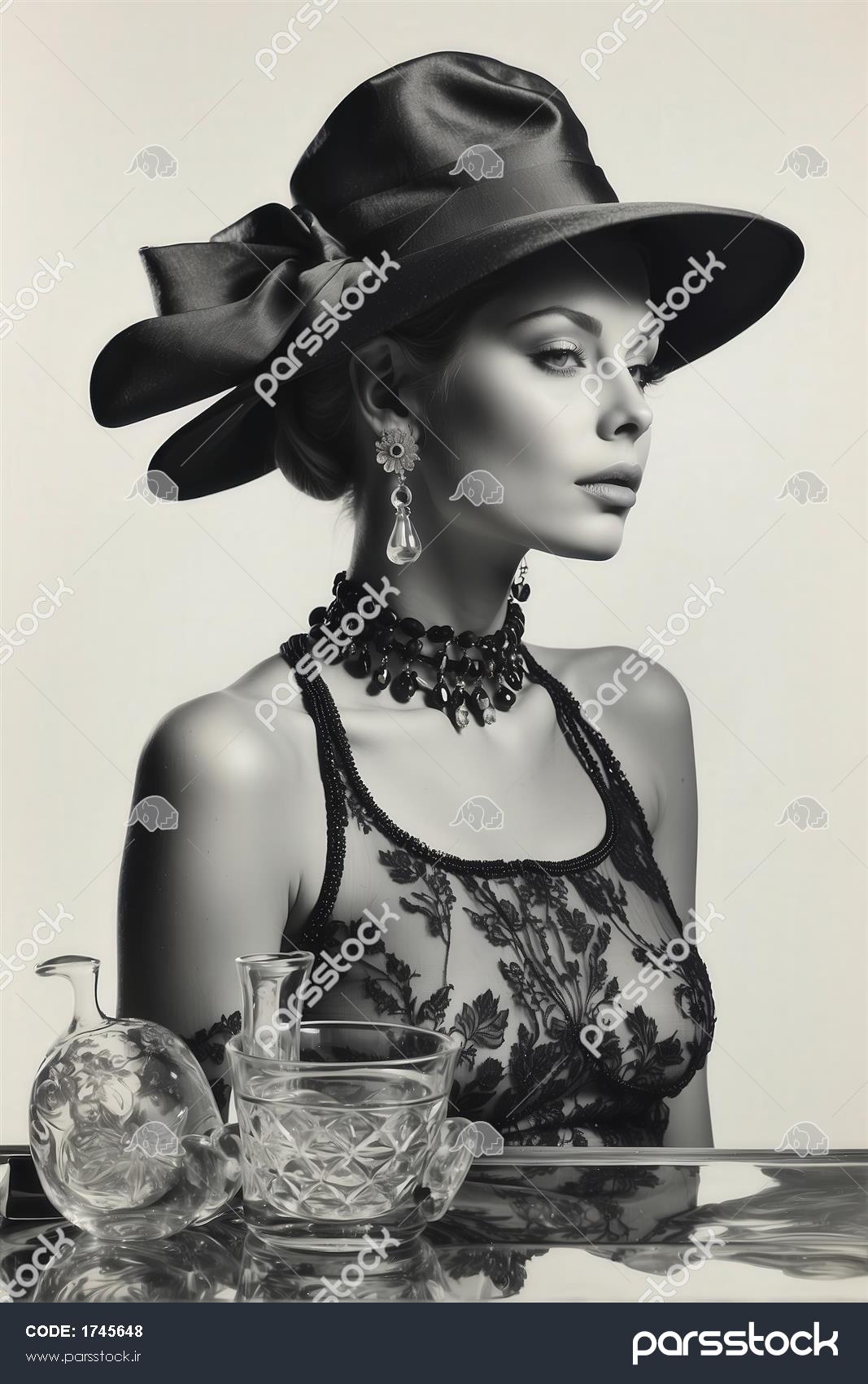 تصویر زن با کلاه لبه‌دار، لباس توری و جواهرات تیره (سبک دهه ۴۰ و ۵۰)