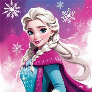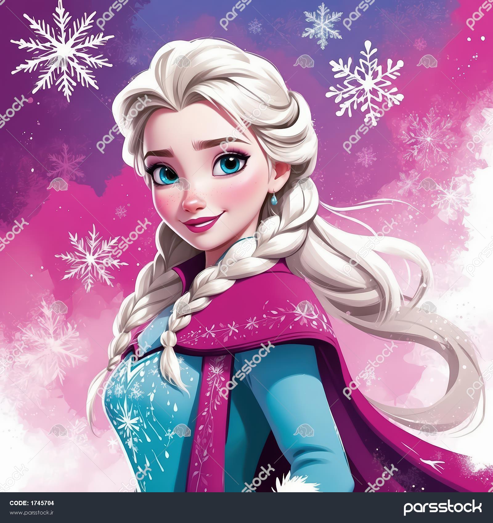 عکس پرتره السا با شنل بنفش و لباس آبی در پس‌زمینه فانتزی صورتی بنفش و دانه‌های برف
