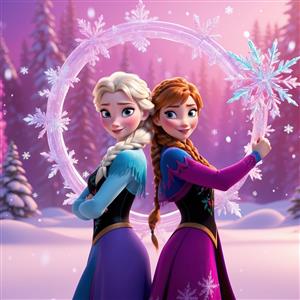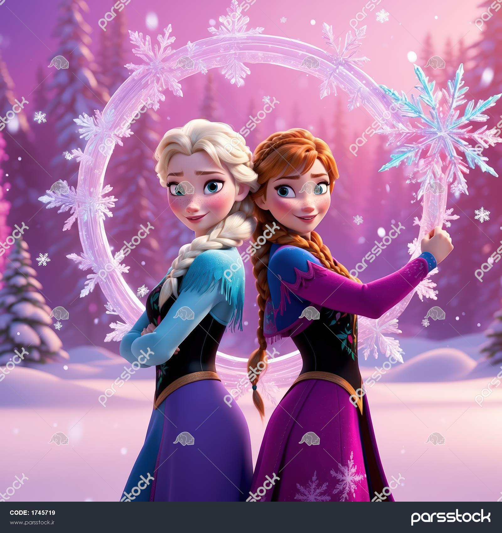 تصویر باکیفیت السا و آنا پشت به پشت با حلقه نورانی و دانه برف بزرگ در جنگل فانتزی