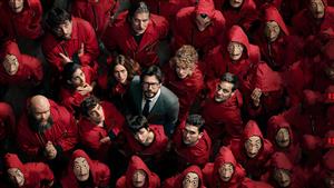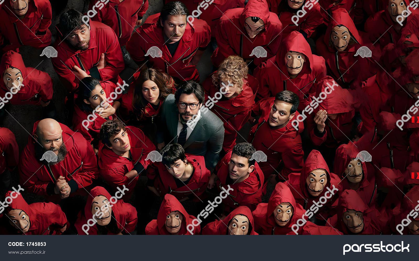 طرح افراد گروه خانه کاغذی با ماسک دالی برای چاپ کوسن و ماگ