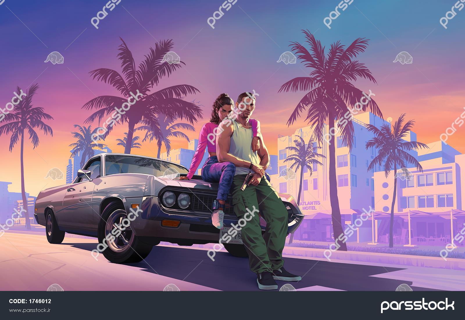 طرح زن و مرد جی تی ای ۶ کنار ماشین کلاسیک برای تابلو تزیینی