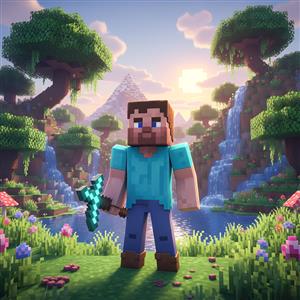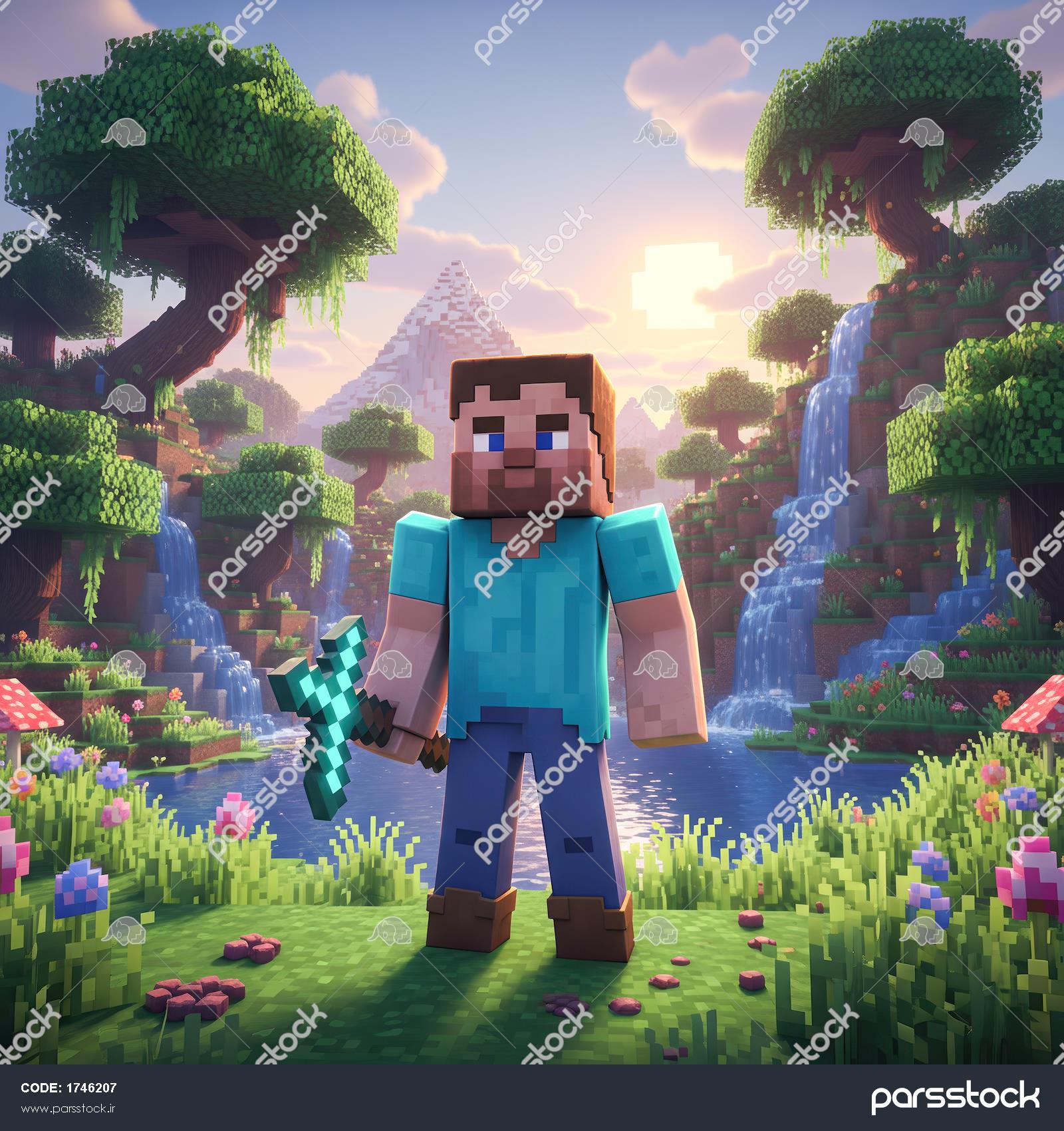 تصویر استیو با کلنگ الماس در منظره فانتزی برای پوستر دیواری