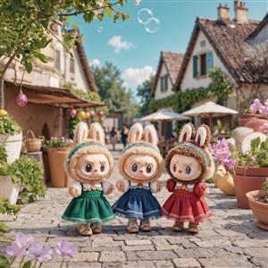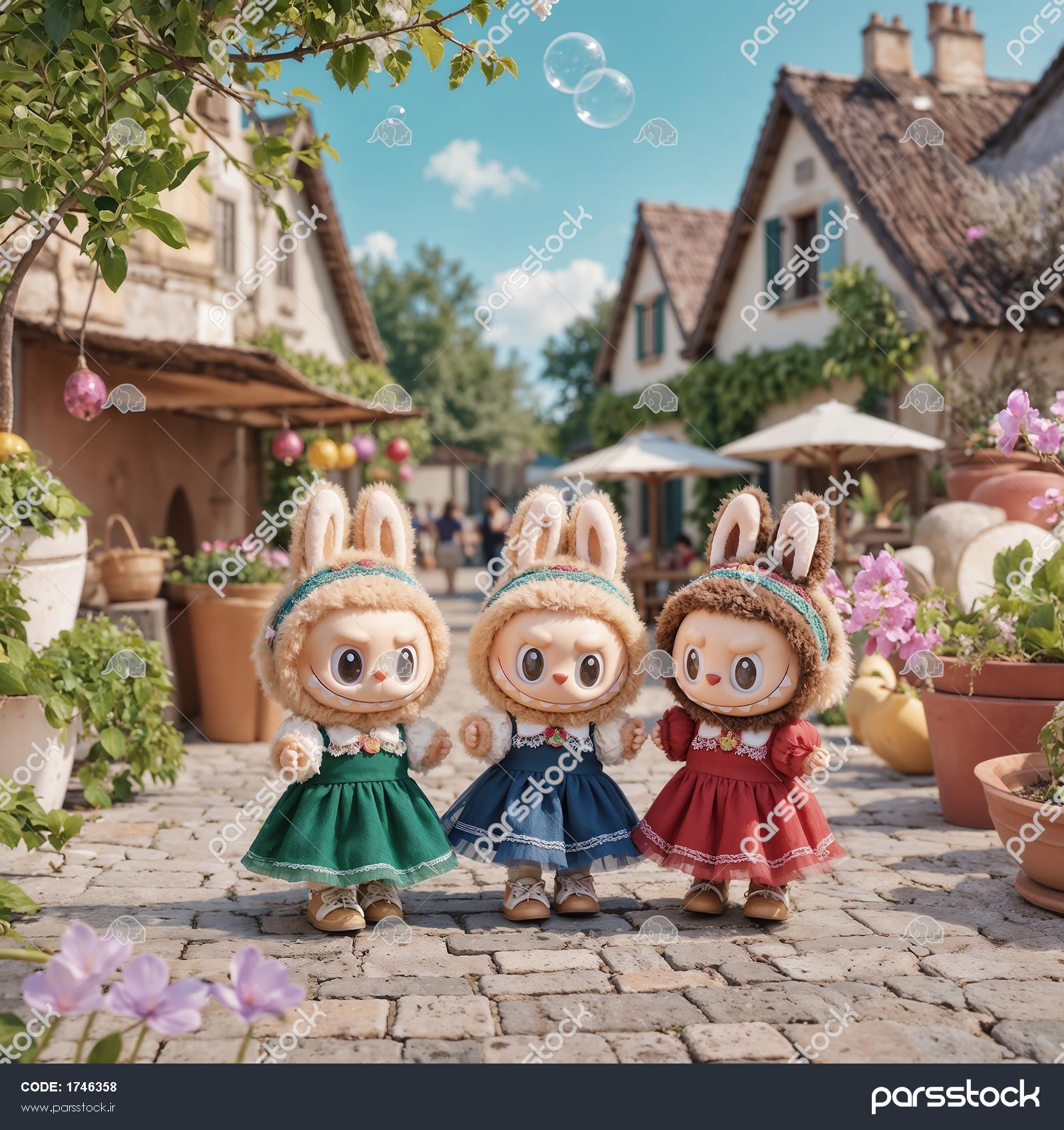 تصویر لبوبوهای فانتزی با لباس‌های سنتی در کوچه سنگی باکیفیت