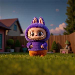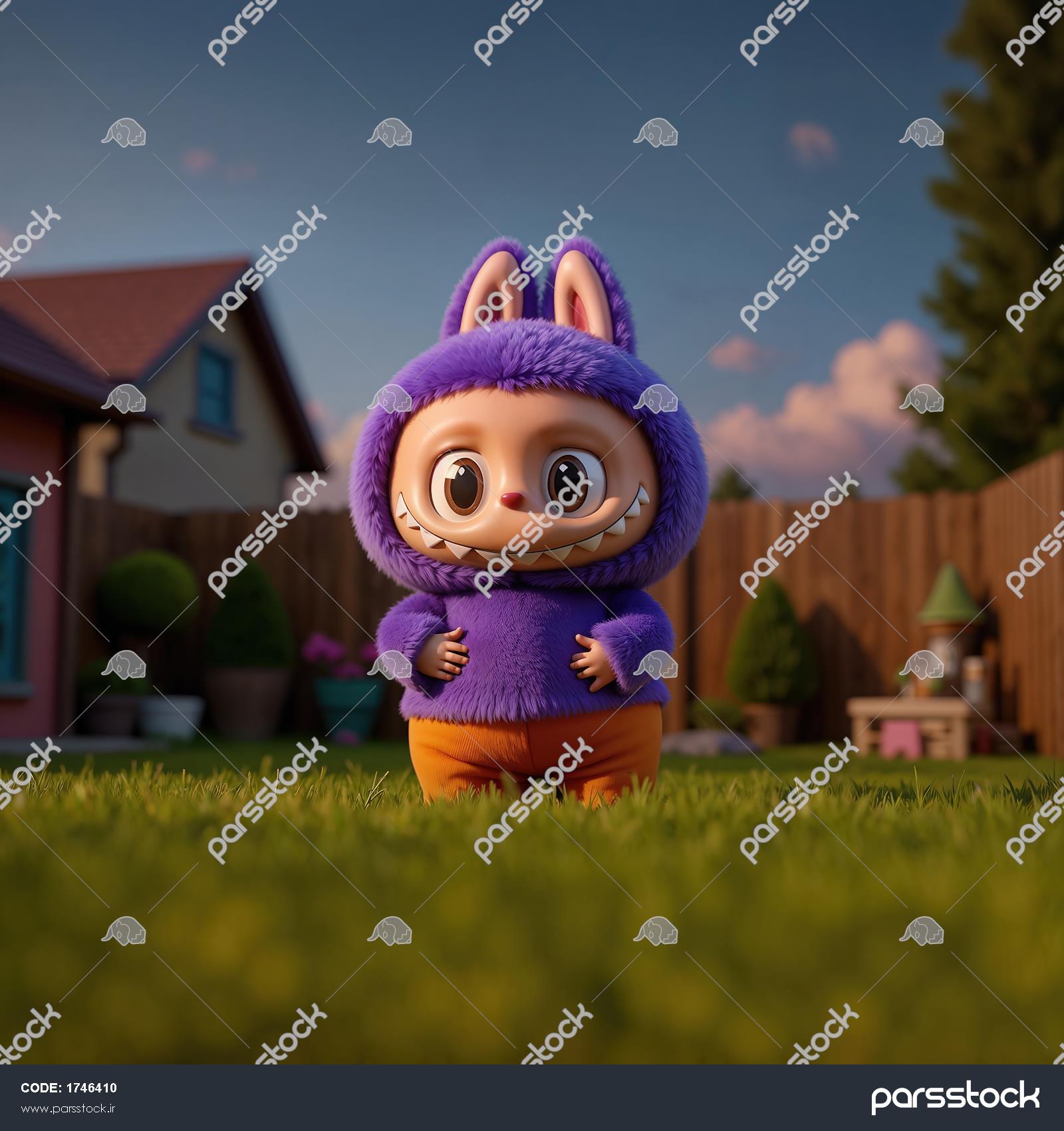 عکس لبوبو بنفش در حیاط چمن برای پوستر دیواری و تابلو اتاق کودک