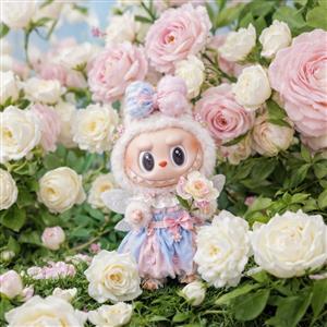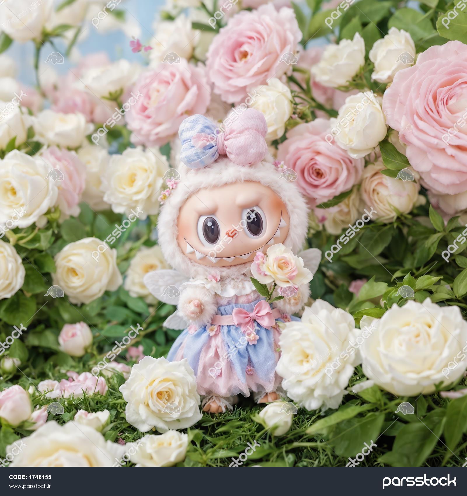 عکس لبوبو پری‌گونه در باغ گل‌های رز صورتی برای پوستر دکوراتیو