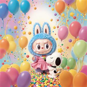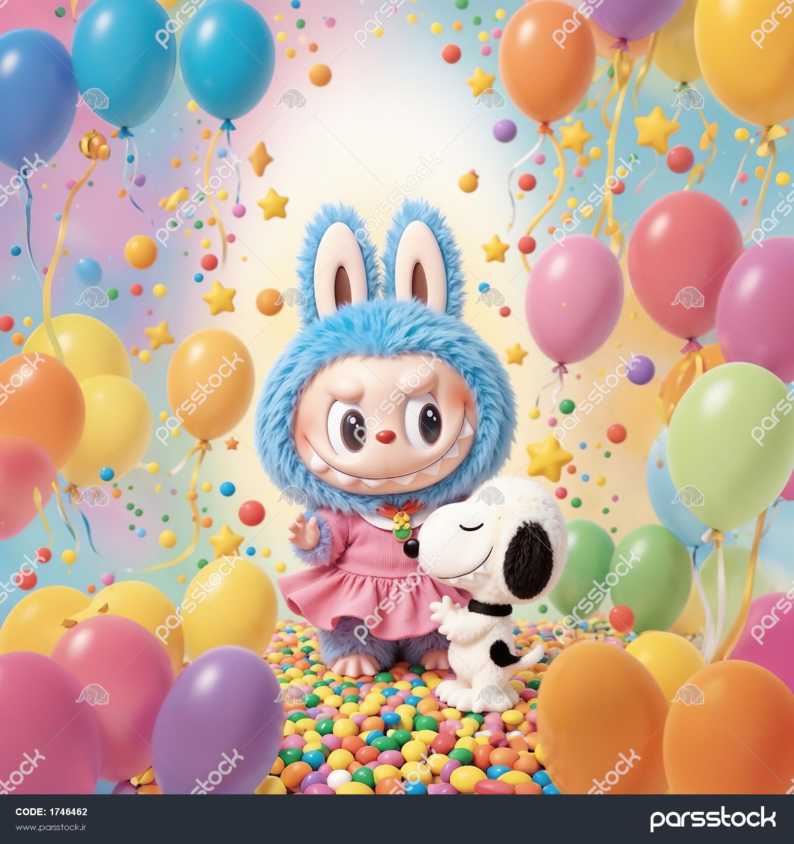 طرح لبوبو و اسنوپی با بادکنک‌های رنگی برای پوستر دکوراتیو تولد و جشن