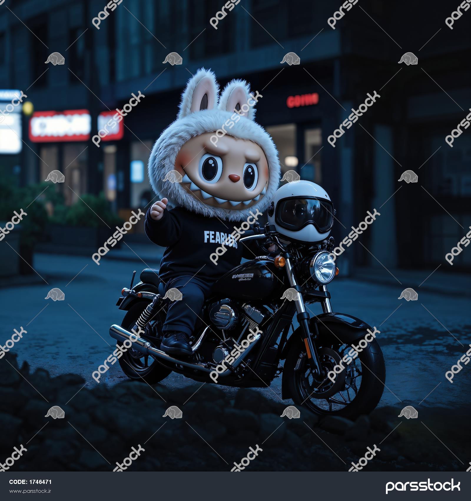 تصویر لبوبو پشمالو سوار موتور سیکلت در شب برای پوستر با تم تیره