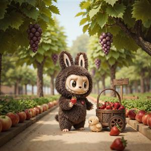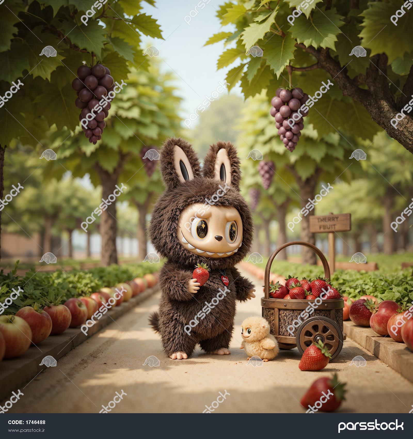 طرح لبوبو با لباس تیره در باغ توت و انگور برای چاپ روی پرده و کوسن