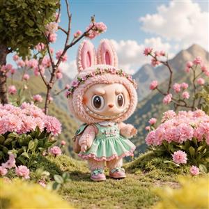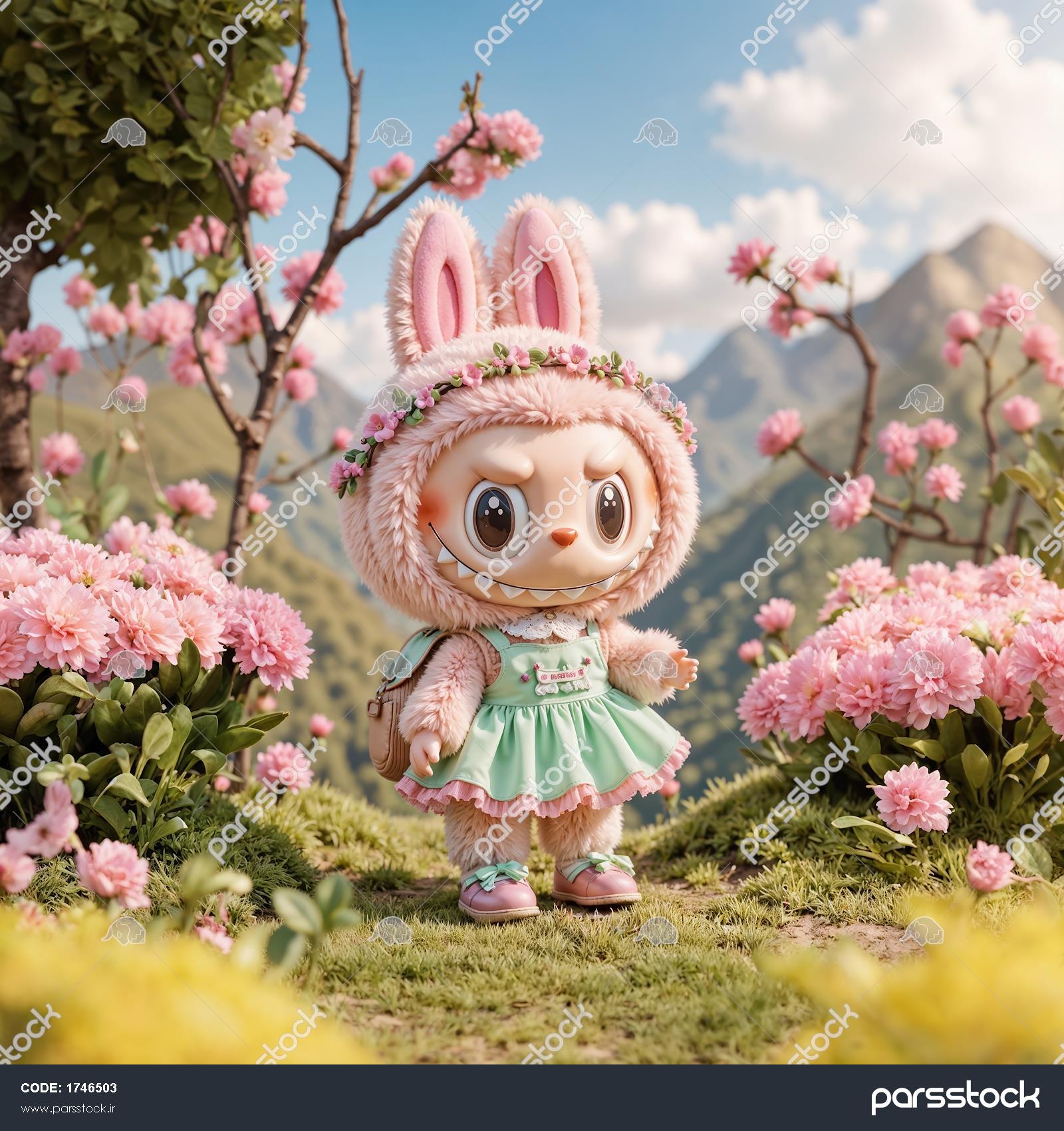 عکس لبوبو با لباس صورتی بهاری در طبیعت شکوفه‌دار برای پرده و روتختی