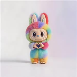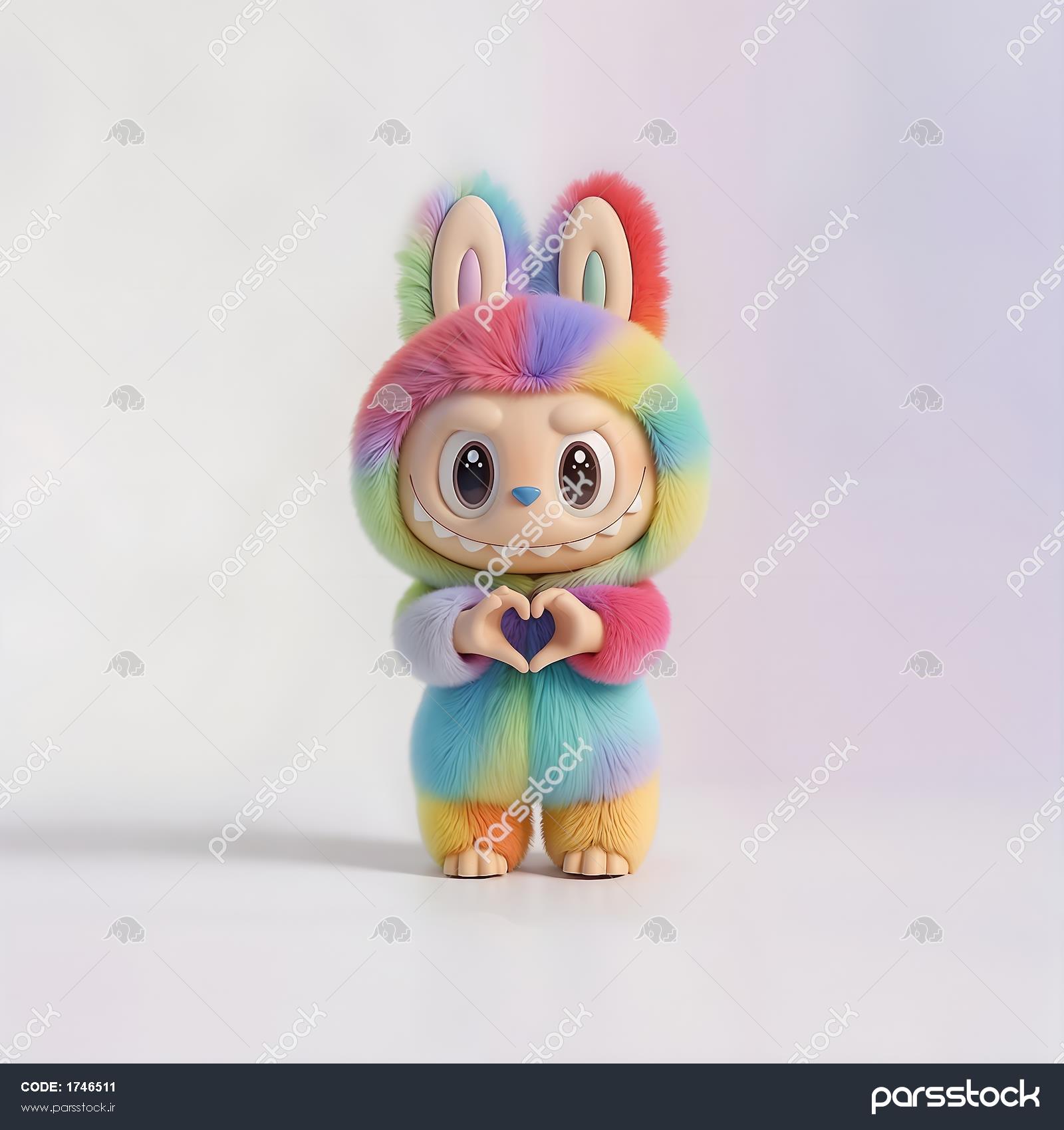 طرح لبوبو رنگین‌کمانی پشمالو با ژست قلب برای پوستر دیواری شاد