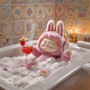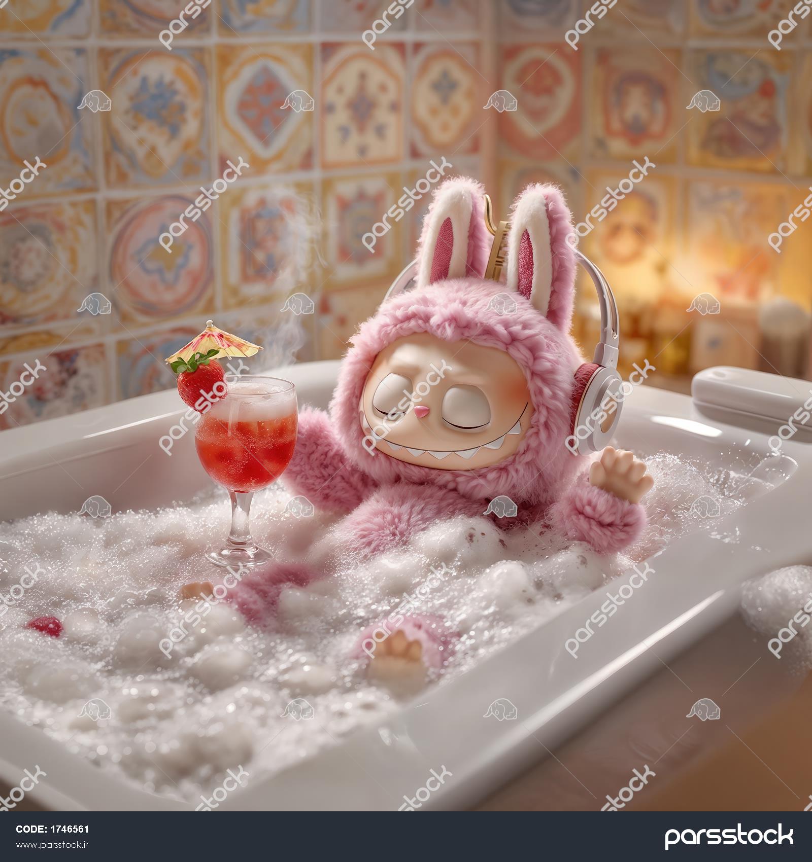 عکس فانتزی لبوبو در حال استراحت در وان حمام با نوشیدنی و هدفون