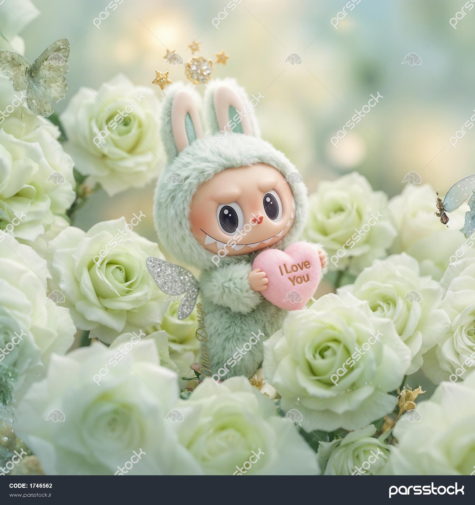 تصویر فانتزی لبوبو فرشته با قلب و گل رز سفید برای پوستر رمانتیک
