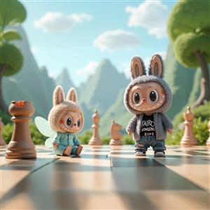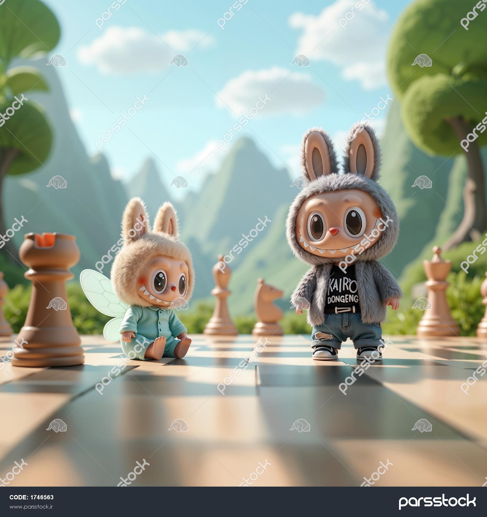 طرح فانتزی دو شخصیت لبوبو روی صفحه شطرنج در طبیعت برای اتاق کودک