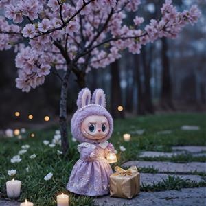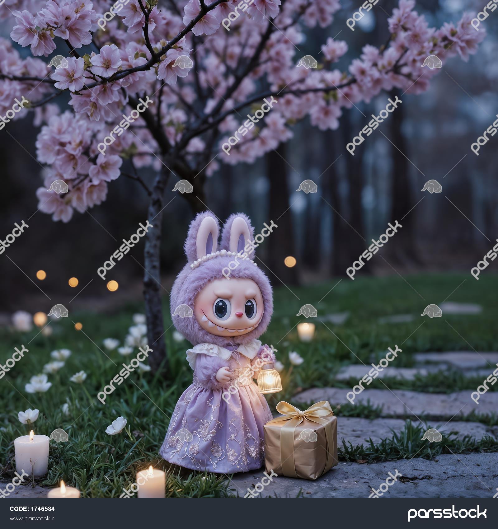 عکس فانتزی لبوبو با لباس بنفش و فانوس در باغ سحرآمیز برای چاپ روی روتختی