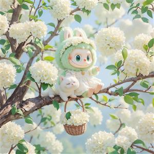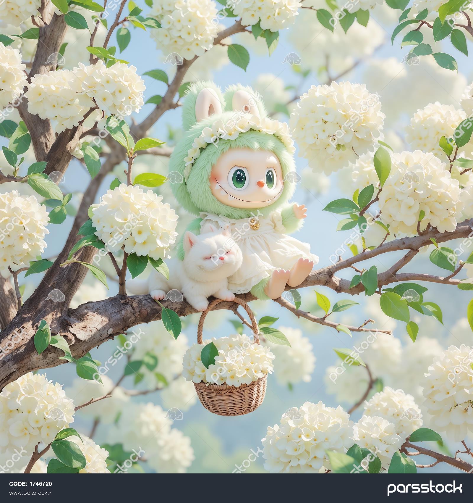 لبوبوی سبز پاستلی در میان شکوفه‌های سفید درخت