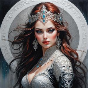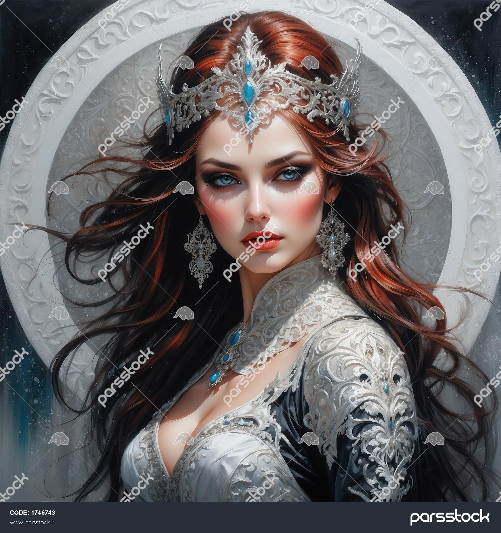طرح زن سلطنتی مو نارنجی و تاج نقره‌ای آبی برای تابلو دکوراتیو