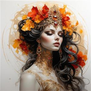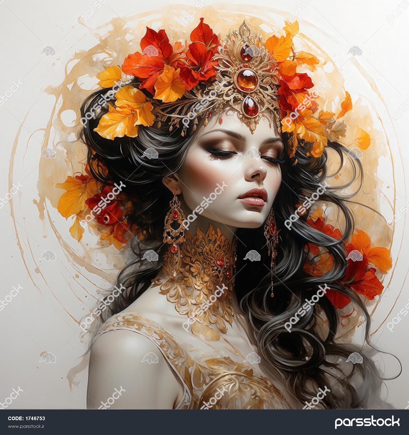 عکس چهره زن سلطنتی با تاج برگ پاییزی و جواهرات درشت باکیفیت