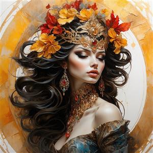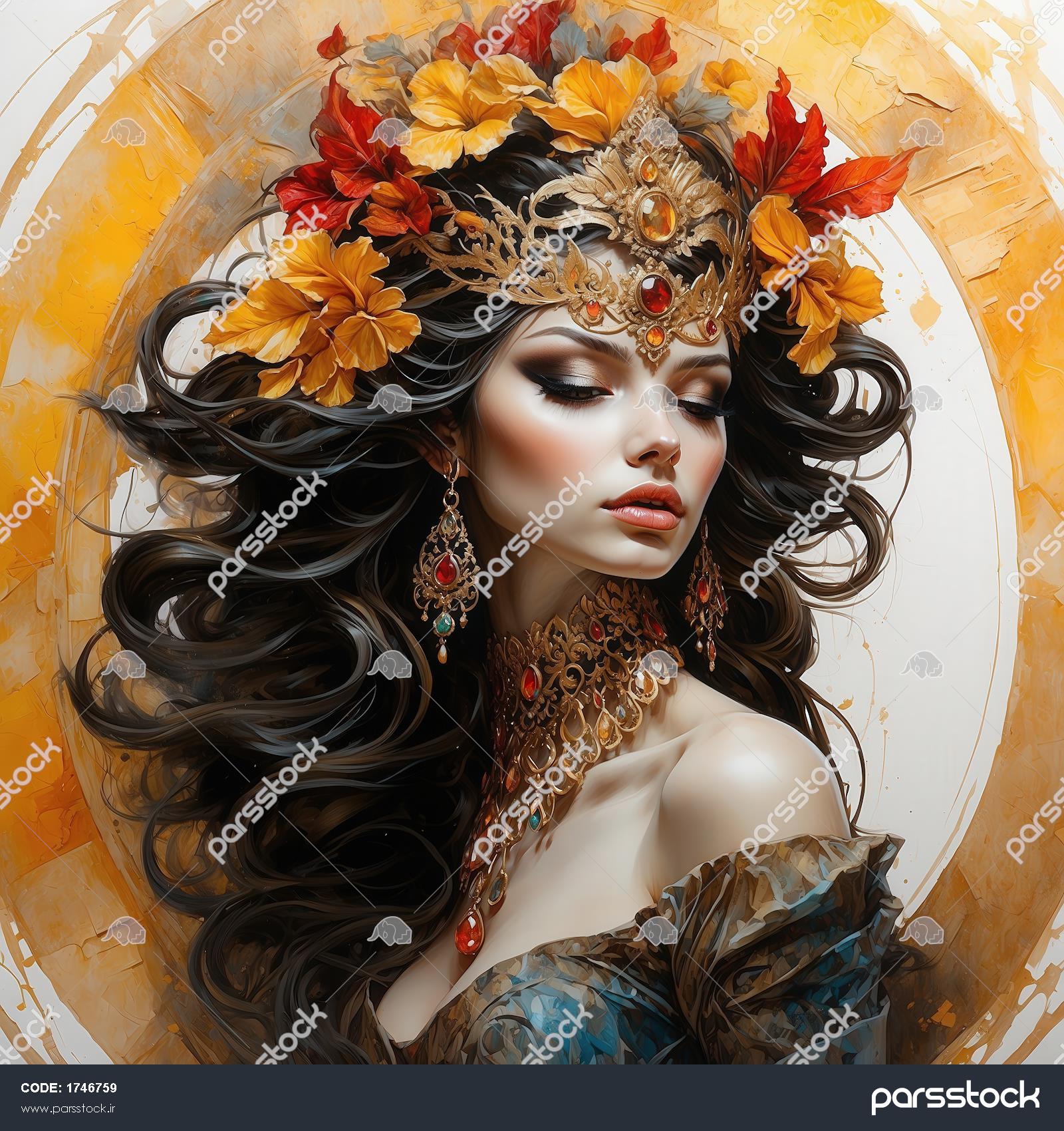 عکس چهره زن فانتزی با تاج گل پاییزی و گردنبند طلایی باکیفیت