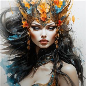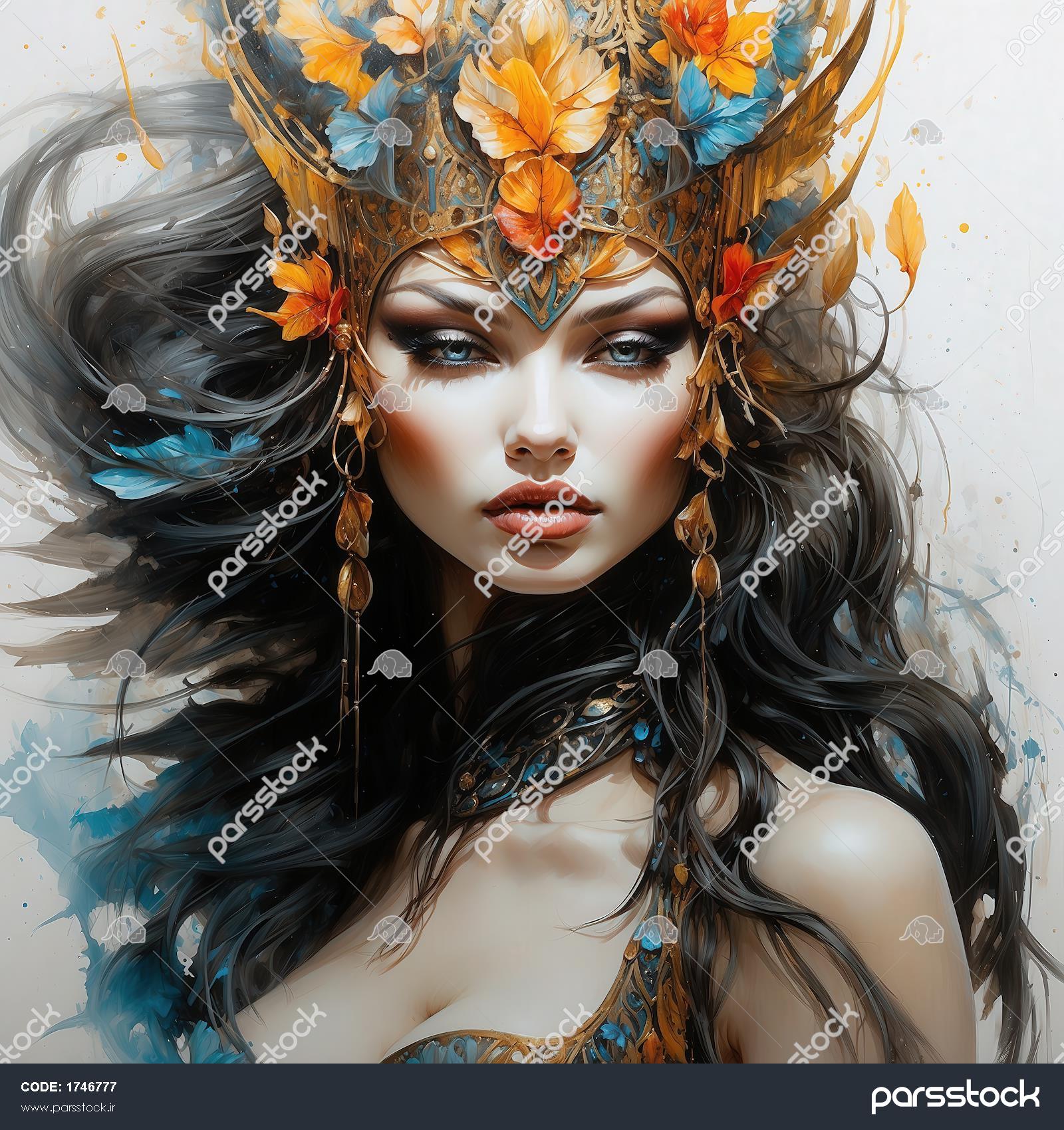 عکس چهره زن فانتزی با گل و پر آبی و نارنجی برای تابلو دکوراتیو