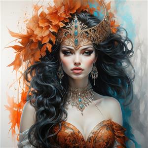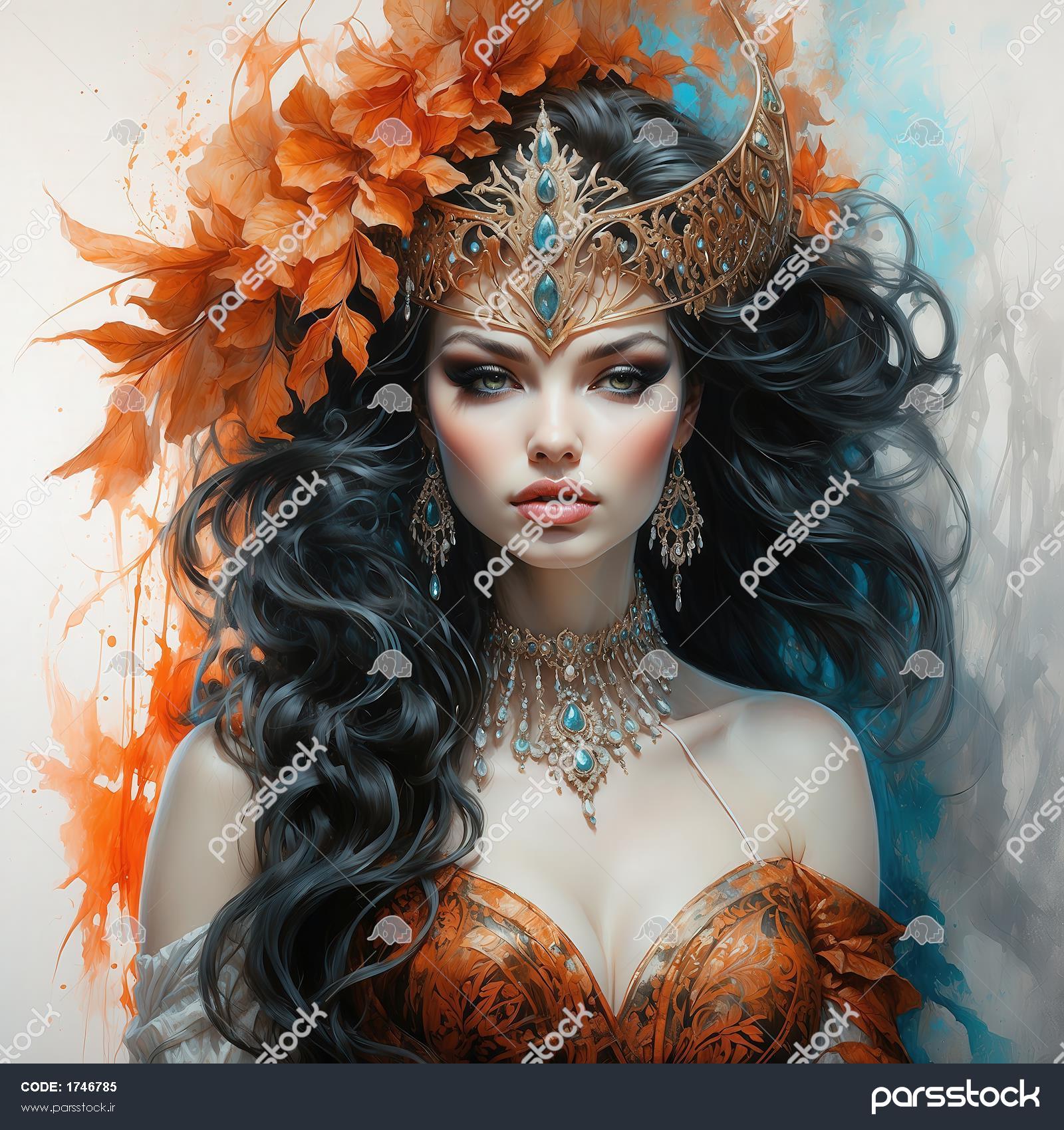 تصویر زن جذاب تاج‌دار با گل نارنجی و لباس دکلته برای پوستر دیواری