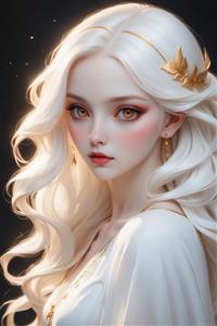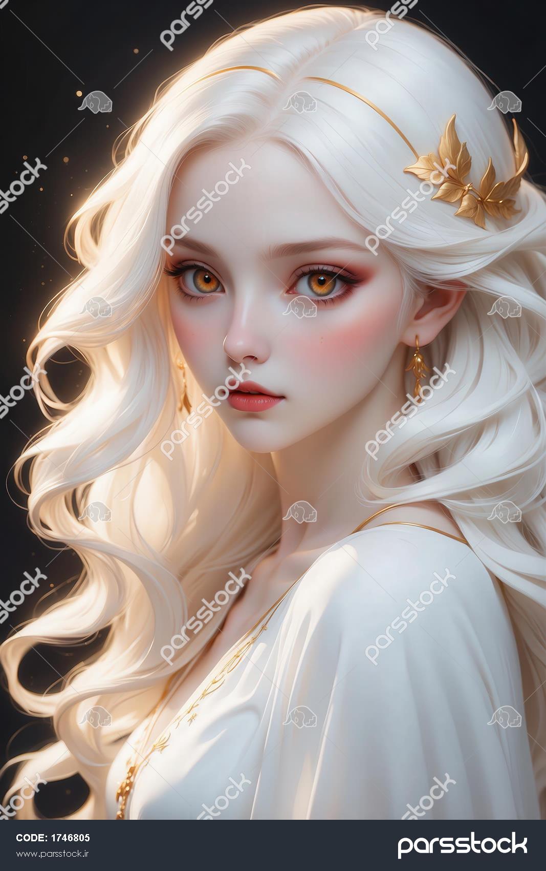 تصویر دختر با موی سفید موج‌دار و سنجاق برگ طلایی برای دکور