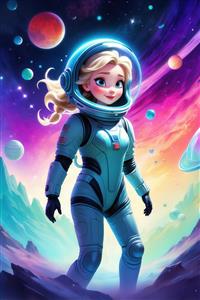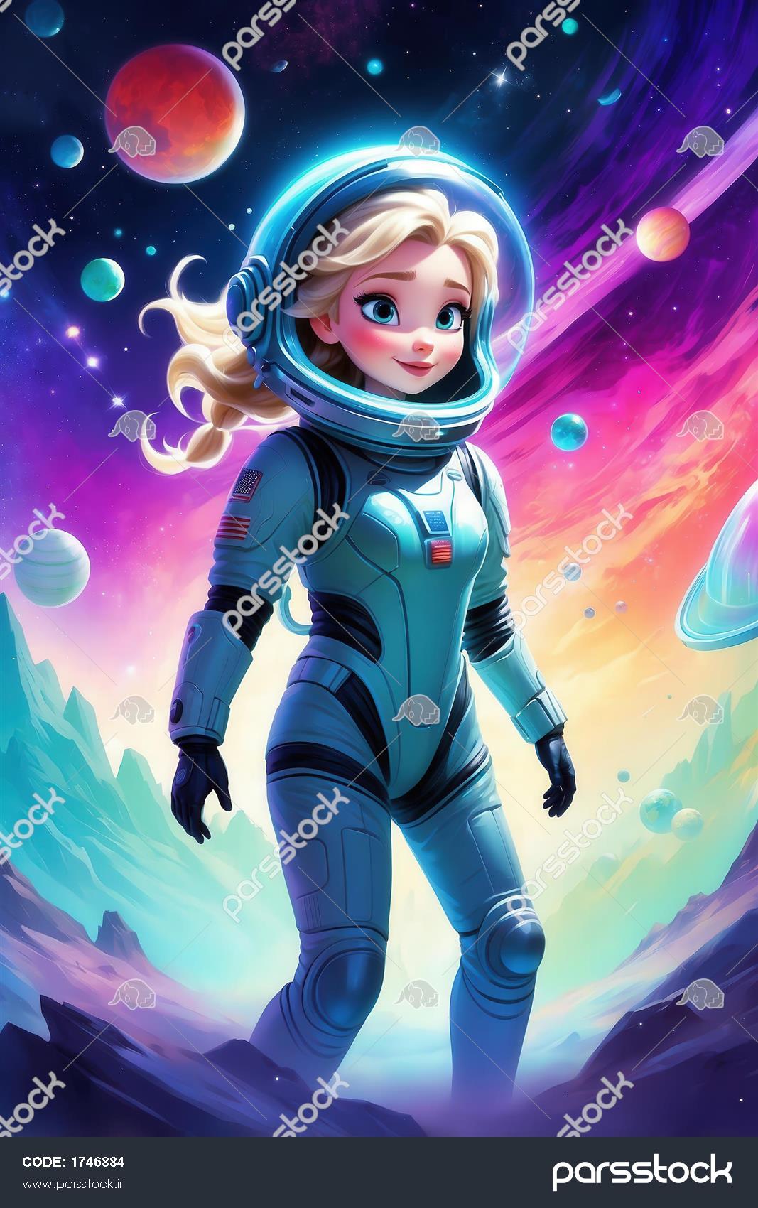 تصویر کارتونی السا فضانورد در سیاره با کوه‌های رنگی برای پوستر