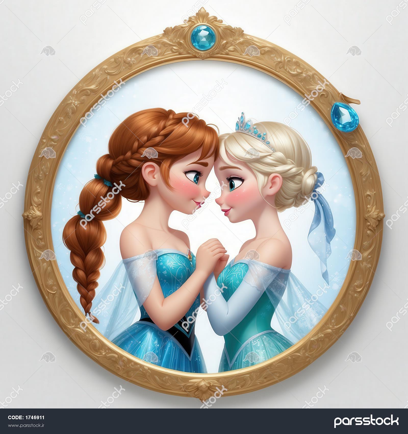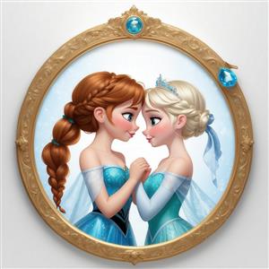 طرح السا و آنا کارتونی با لباس آبی در قاب دایره طلایی برای تابلو