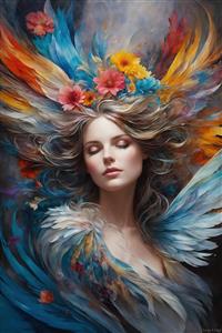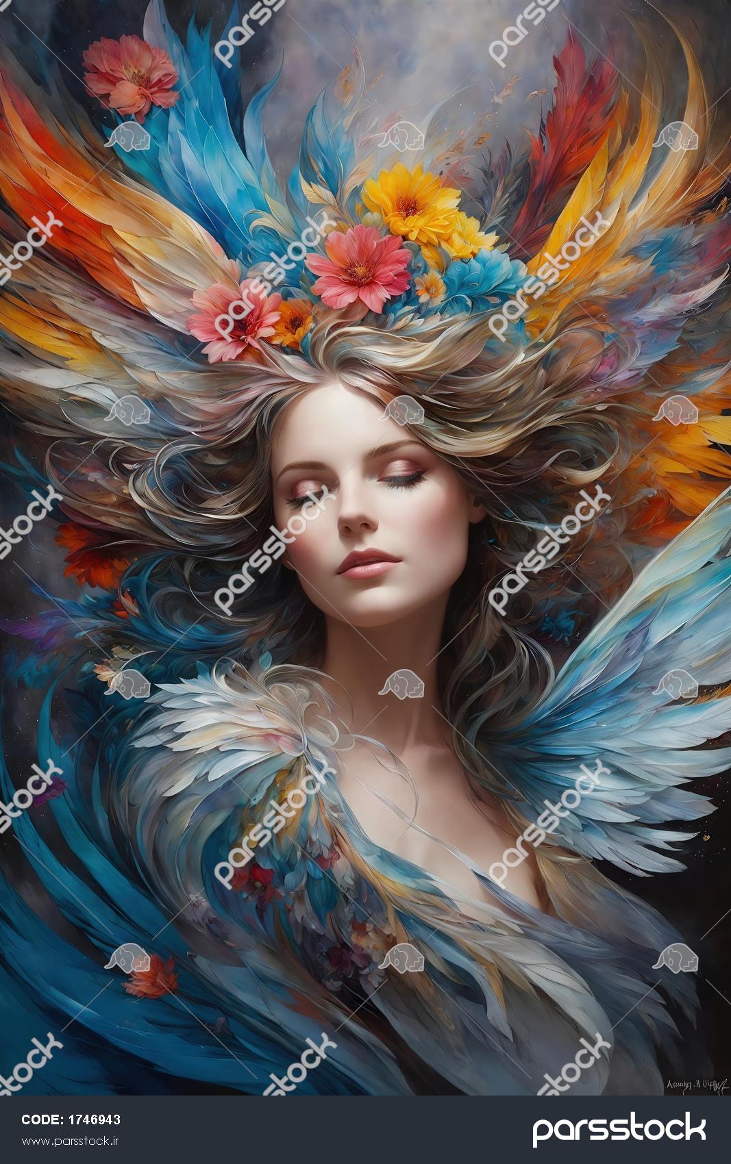 عکس پرتره زن فرشته با تاج گل و موهای پردار رنگارنگ برای دکور دیوار
