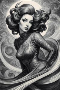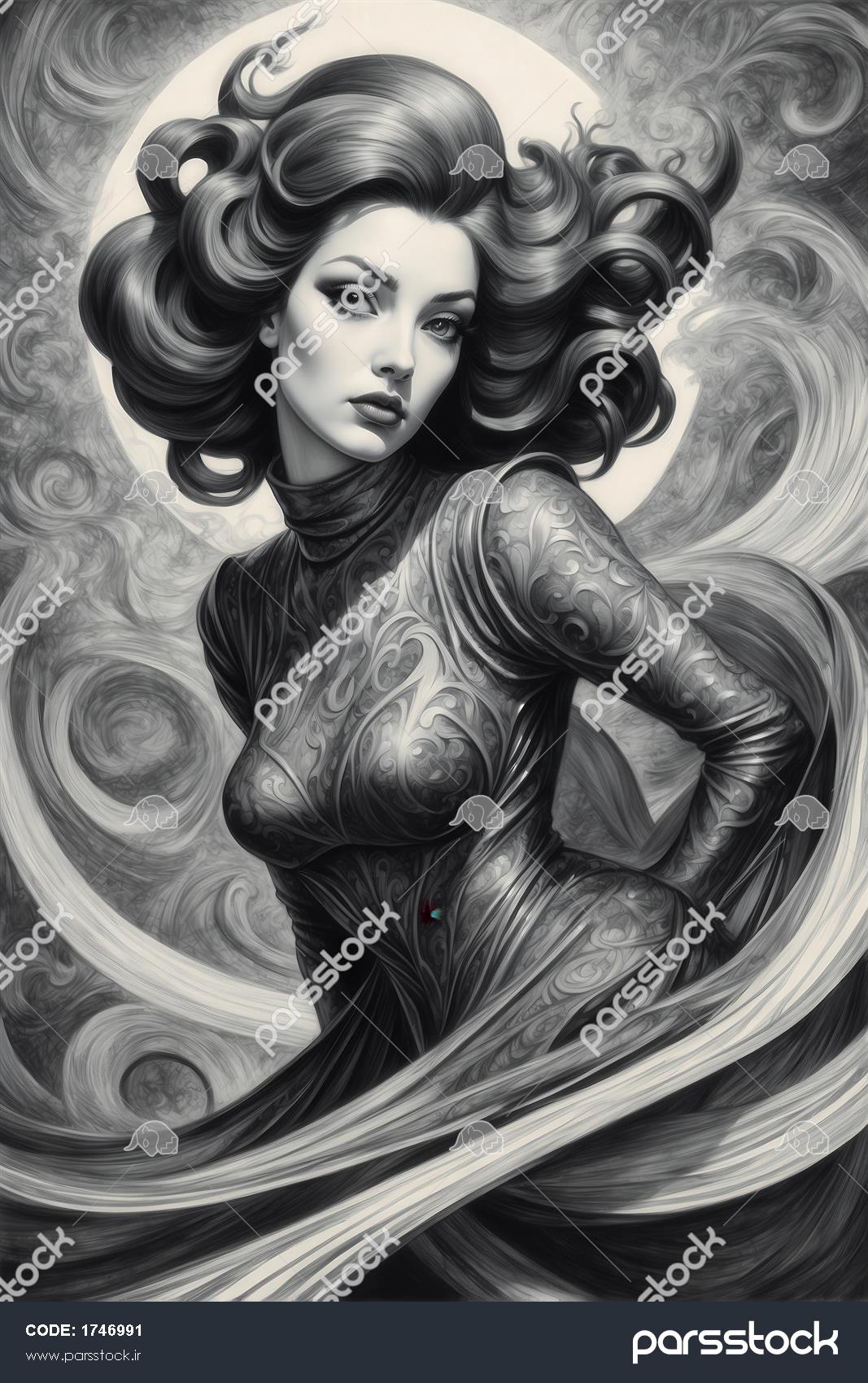 عکس زن با لباس مشکی و موهای پر حجم در پس‌زمینه آبستره سیاه و سفید