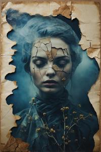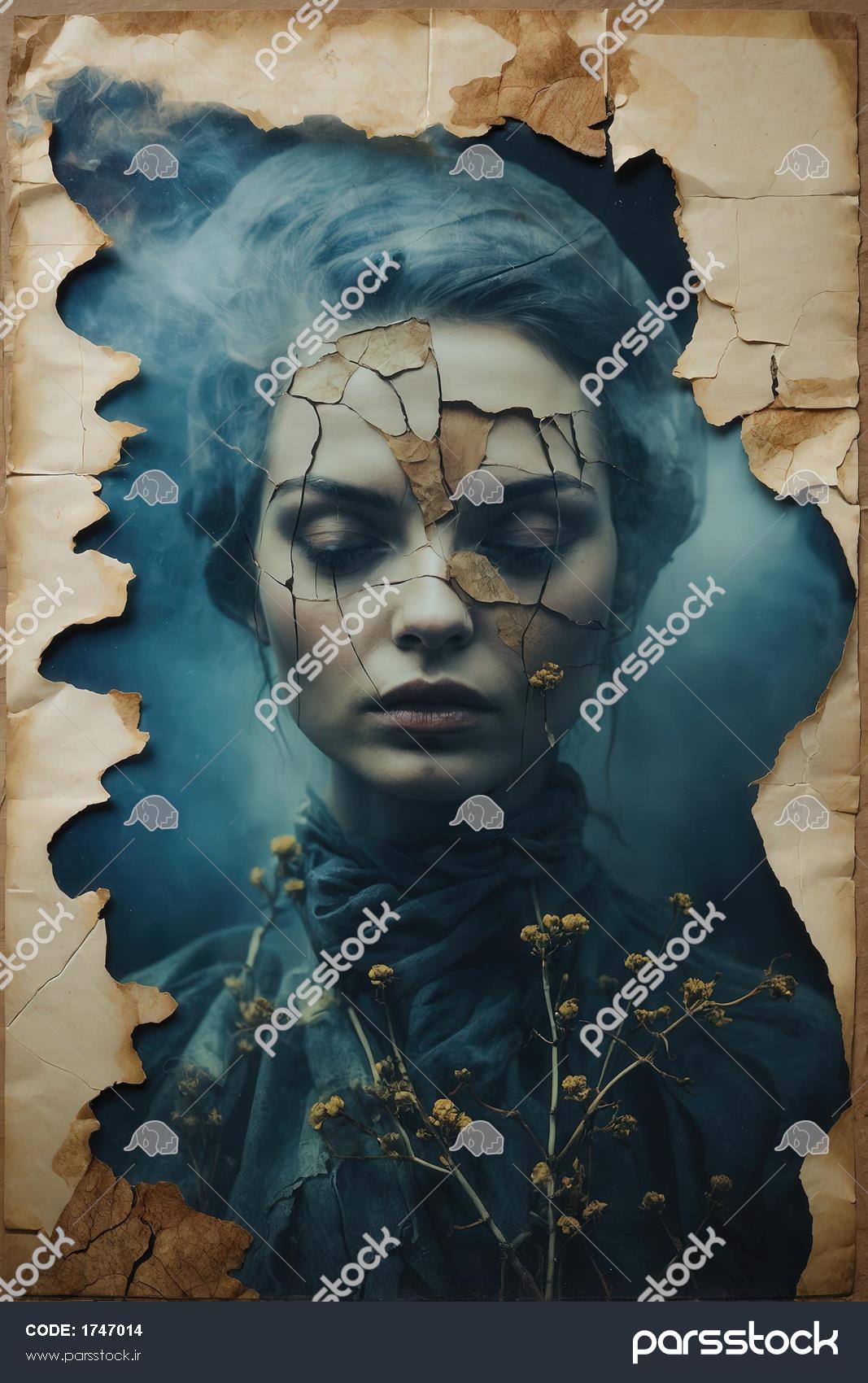 طرح پرتره زن غمگین با پارگی کاغذ و ریشه‌های خشک برای تابلو اتاق خواب