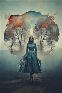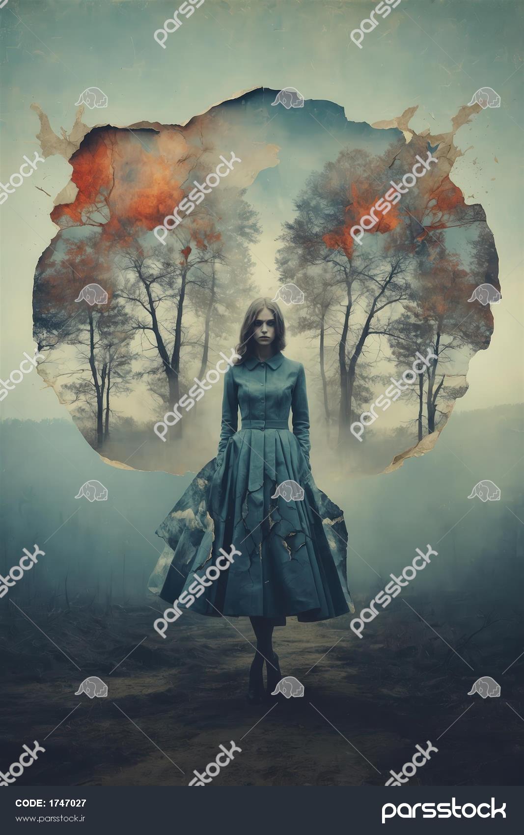 عکس دختر گوتیک در مه با فضای غم‌انگیز برای چاپ روی تابلو دکوراتیو مرموز