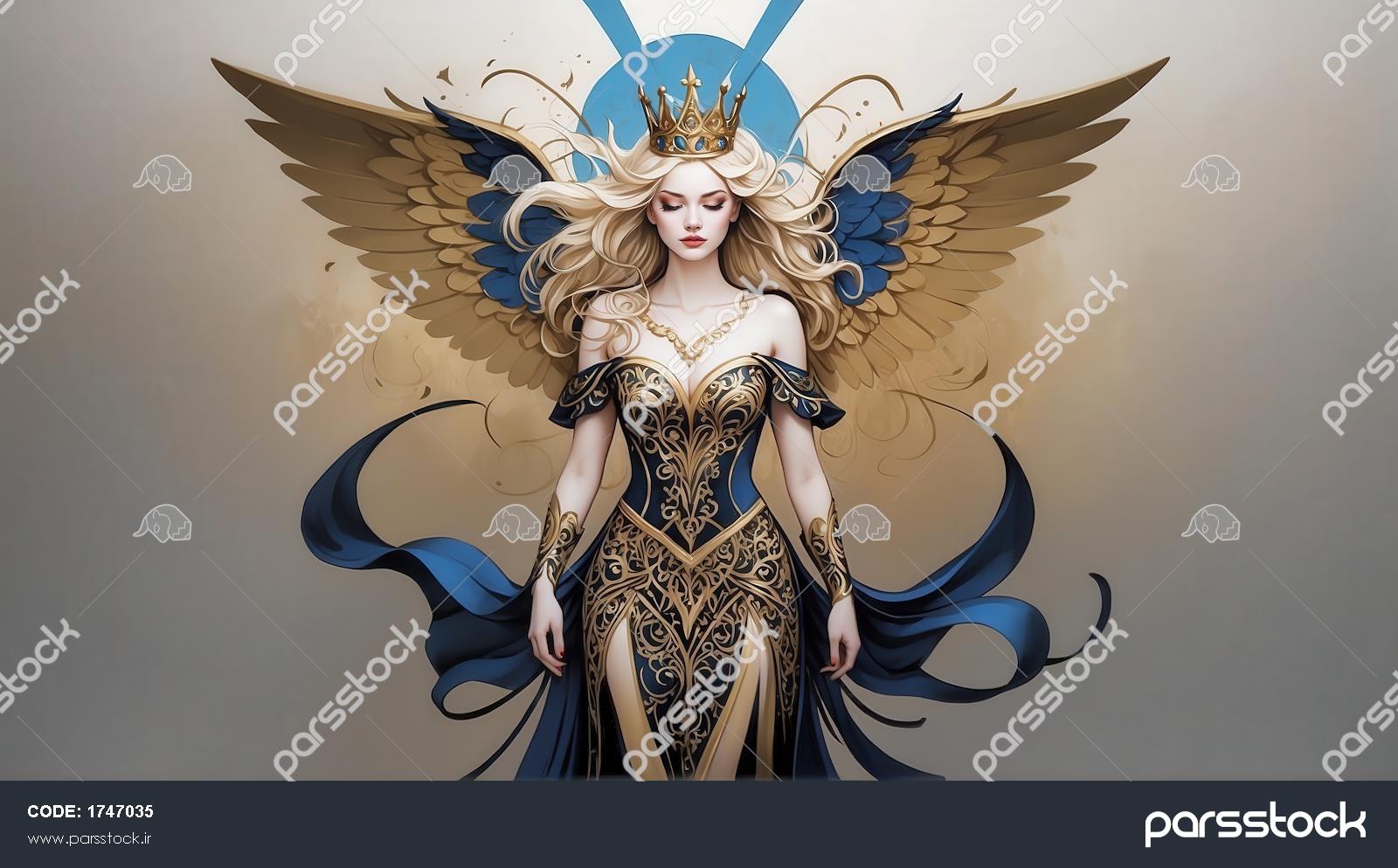 تصویر فرشته زیبای زن با بال طلایی و لباس آبی سلطنتی برای تابلو اتاق خواب طرح فرشته بال طلایی با لباس آبی و تاج سلطنتی برای تابلو طرح زن بالدار و تاجدار با لباس فاخر طلایی و آبی برای دکوراسیون پذیرایی تصویر الهه با لباس آستین بلند طلایی آبی برای تابلو دکوراتیو تصویر ملکهی بالدار با موی آبی و لباس طلایی پولکی برای تابلو طرح فرشته بال طلایی با موهای روشن و لباس مجلل برای تابلو تصویر فرشته با لباس طلایی و تاج آبی برای پوستر دکوراتیو پذیرایی عکس زن فرشته با لباس طلایی و آبی و بالهای پر باکیفیت برای دکور تصویر فرشته با بالهای دو رنگ و لباس طلایی برای تابلو طرح فرشته با لباس مجلل طلایی و نگین آبی برای چاپ دکوراتیو مشاهده همه