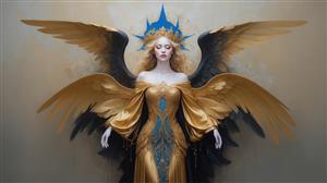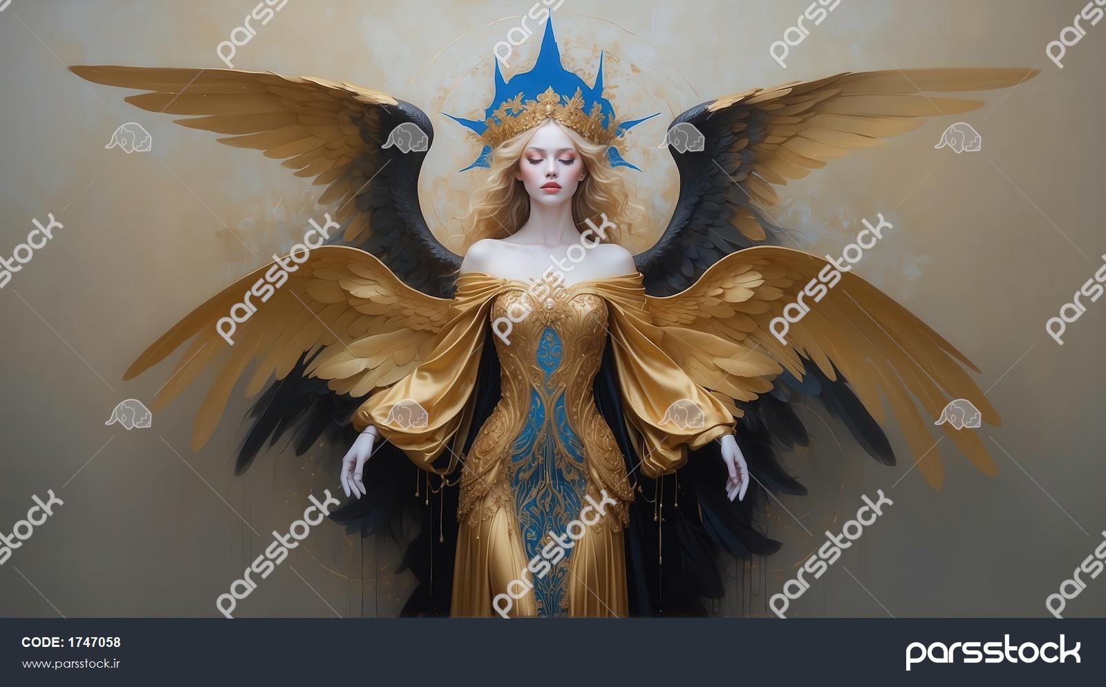 تصویر فرشته با بال‌های دو رنگ و لباس طلایی برای تابلو