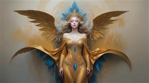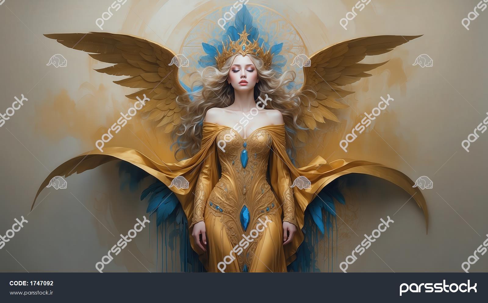 طرح زن فرشته با لباس طلایی، شال گشاد و بال‌های پهن برای تابلو دیواری