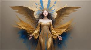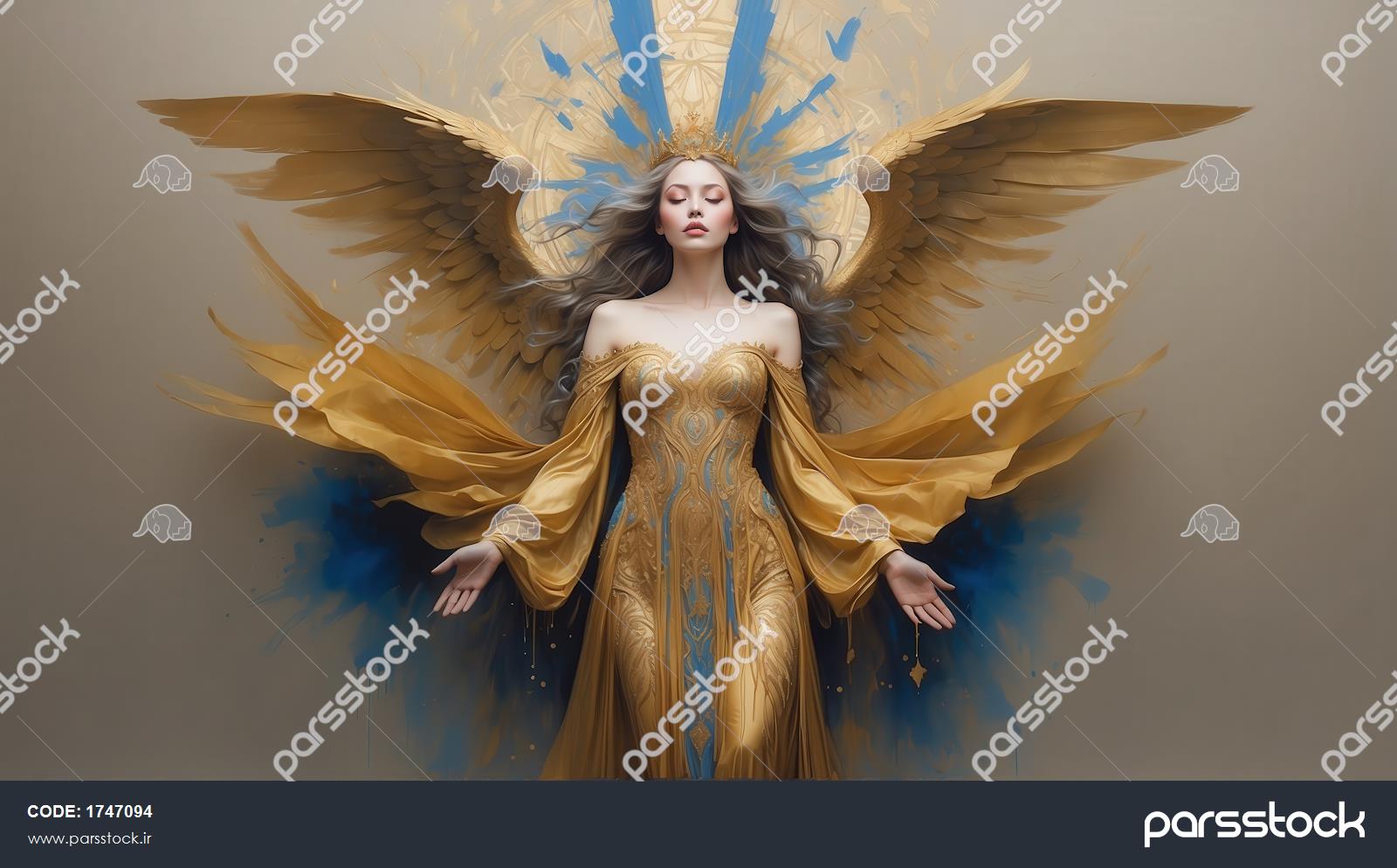 عکس زن فرشته با لباس طلایی و شال گشاد و پاشش رنگ آبی در پس‌زمینه