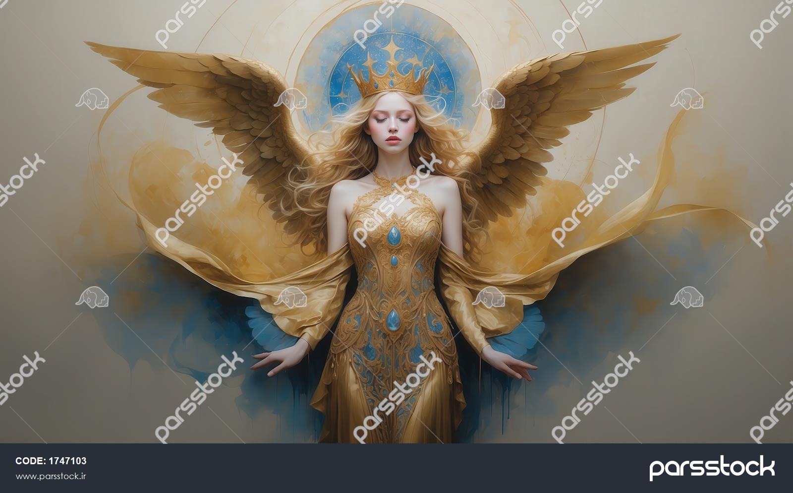 عکس فرشته زن با بالهای پرجزئیات طلایی و لباس آبی برای چاپ عریض طرح زن فرشته با بال طلایی بزرگ، لباس آبی و طلایی و پسزمینه روشن طرح فرشته زن پرشکوه با بال و لباس طلایی آبی برای دکوراسیون منزل تصویر زن فرشته با لباس سفید و طلایی و پسزمینه انتزاعی طلایی و آبی تصویر فرشته زن با لباس سلطنتی طلایی آبی و بالهای بزرگ عکس فرشته زن با لباس طلایی و آبی، بال و تاج طلایی مناسب تابلو تصویر زن فرشته با لباس بالاتنه طرحدار آبی و طلایی برای پوستر لاکچری طرح فرشته زن با بالهای طلایی و لباس آبی و گردنبند بزرگ طلایی طرح دکوراتیو فرشته زن با لباس طلایی و آبی و جواهرات باکیفیت عکس فرشته زن با لباس سفید، طلایی و آبی برای پوستر دیواری باکیفیت نمایش همه