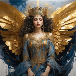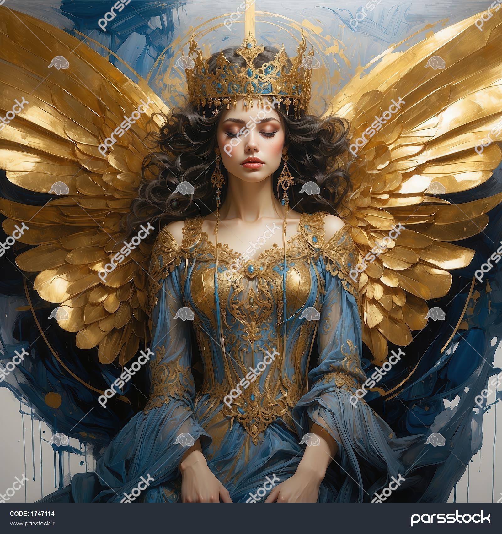 پرتره زن فرشته با موی تیره، تاج طلایی و لباس آبی سلطنتی برای تابلو