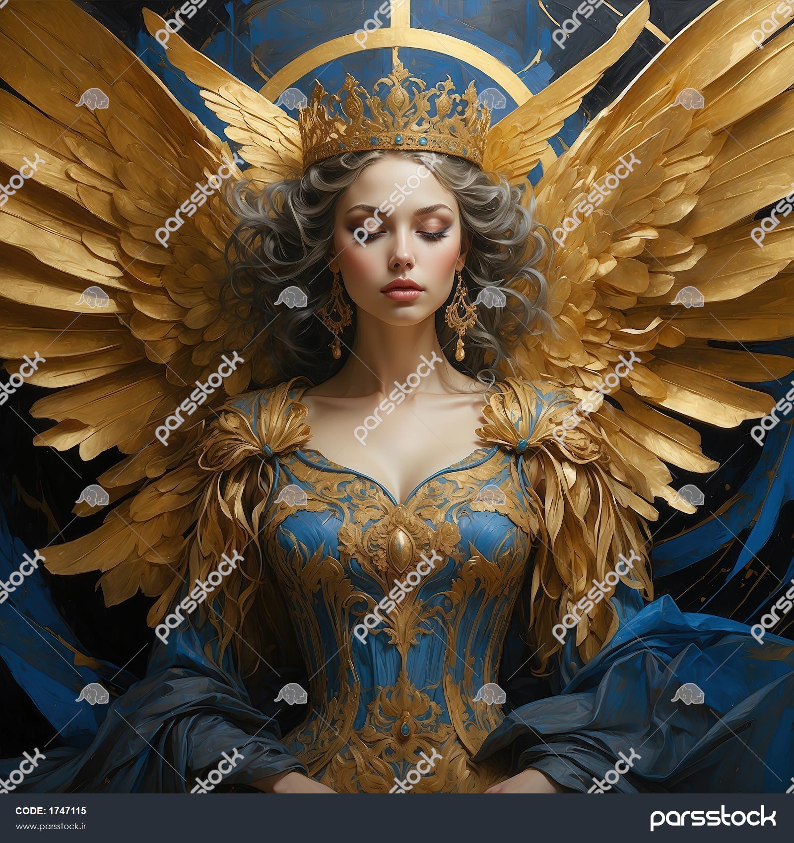 تصویر زن فرشته با بال طلایی ساده و لباس طلایی آبی مناسب چاپ روی ماگ پوستر زن فرشته با پوست آبی و لباس طلایی و بالهای بزرگ برای چاپ عکس فرشته زن با بالهای پرجزئیات طلایی و لباس آبی برای چاپ عریض طرح زن فرشته با لباس آبی و طلایی و موهای بلوند برای چاپ روی کوسن تصویر زن فرشته با موی آبی، لباس طلایی و شنل آبی برای چاپ عریض تصویر فرشته زن با لباس آبی طلایی، بال و تاج بزرگ برای چاپ دکور پرتره زن فرشته با موی تیره، تاج طلایی و لباس آبی سلطنتی برای تابلو طرح زن فرشته با بال طلایی بزرگ، لباس آبی و طلایی و پسزمینه روشن طرح زن فرشته با لباس طلایی پرنگین و بالهای پهن مناسب چاپ عریض طرح فرشته زن پرشکوه با بال و لباس طلایی آبی برای دکوراسیون منزل مشاهده همه