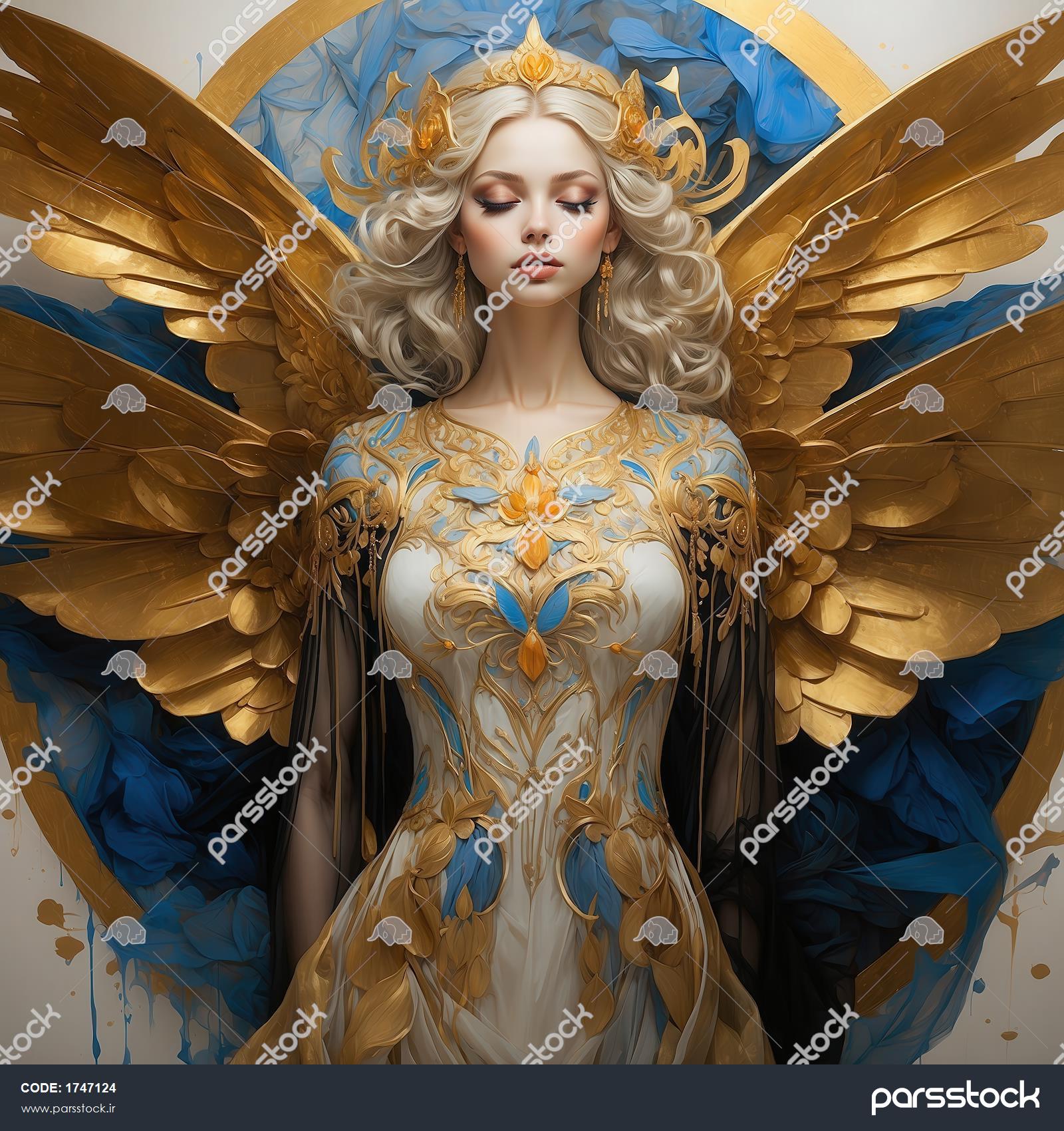 عکس فرشته زن با لباس سفید، طلایی و آبی برای پوستر دیواری باکیفیت