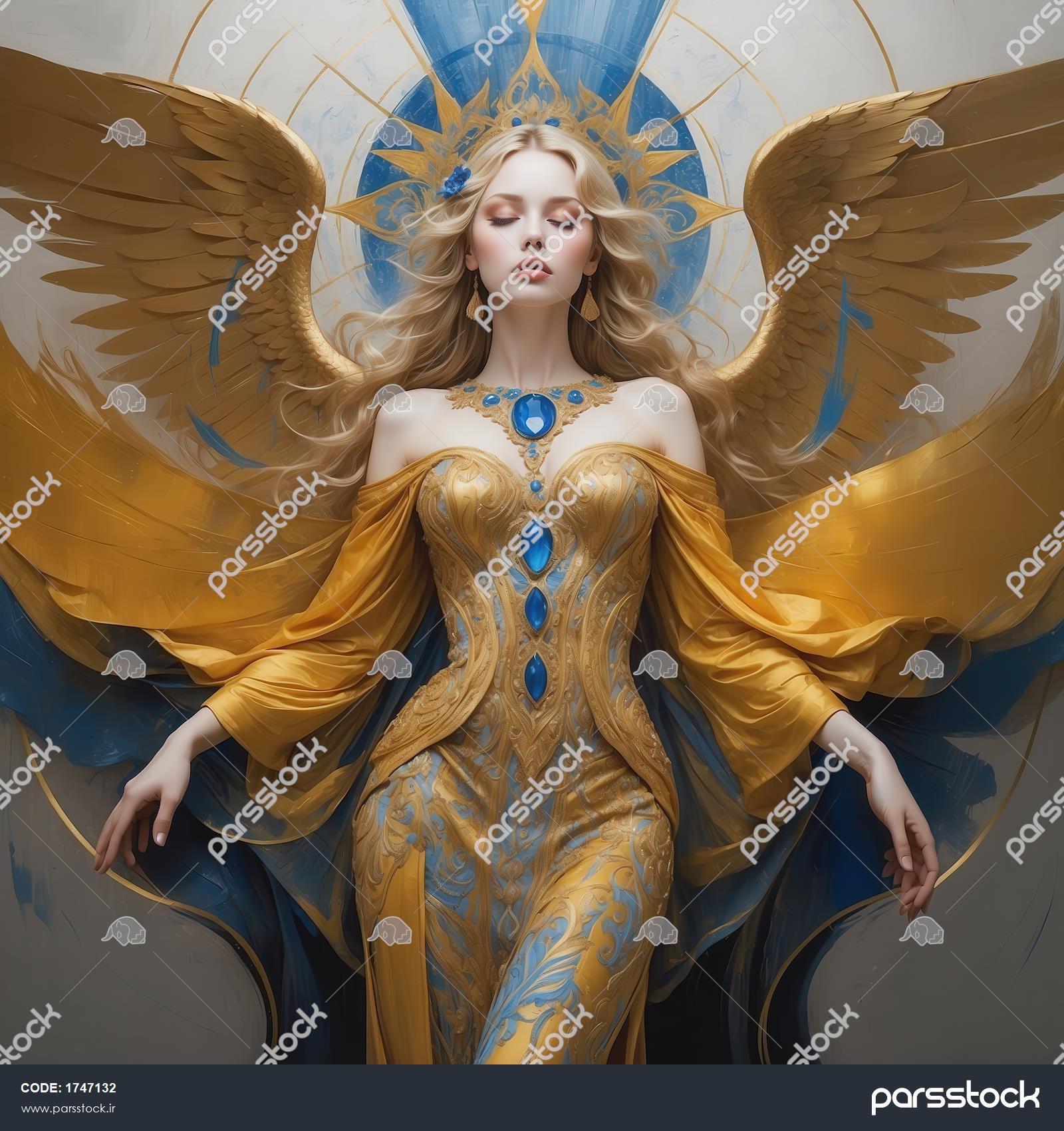طرح زن بالدار و تاجدار با لباس فاخر طلایی و آبی برای دکوراسیون پذیرایی عکس دکوراتیو فرشته زن با لباس طلایی و آبی طرحدار برای تابلوی پذیرایی پوستر فرشته زن با بالهای عظیم طلایی و لباس آبی سلطنتی تصویر فرشته زن با لباس سلطنتی طلایی آبی و بالهای بزرگ عکس فرشته زن با لباس سفید، طلایی و آبی برای پوستر دیواری باکیفیت عکس فرشته زن با بالهای پرجزئیات طلایی و لباس آبی برای چاپ عریض تصویر زن فرشته با لباس بالاتنه طرحدار آبی و طلایی برای پوستر لاکچری پوستر زن فرشته با لباس تنگ طلایی و بالهای پر دار بزرگ طلایی آبی عکس زن فرشته با لباس روان طلایی و آبی و پسزمینه انتزاعی روشن عکس زن فرشته با لباس تنگ طلایی و آبی و بالهای پهن برای دکوراسیون نمایش همه
