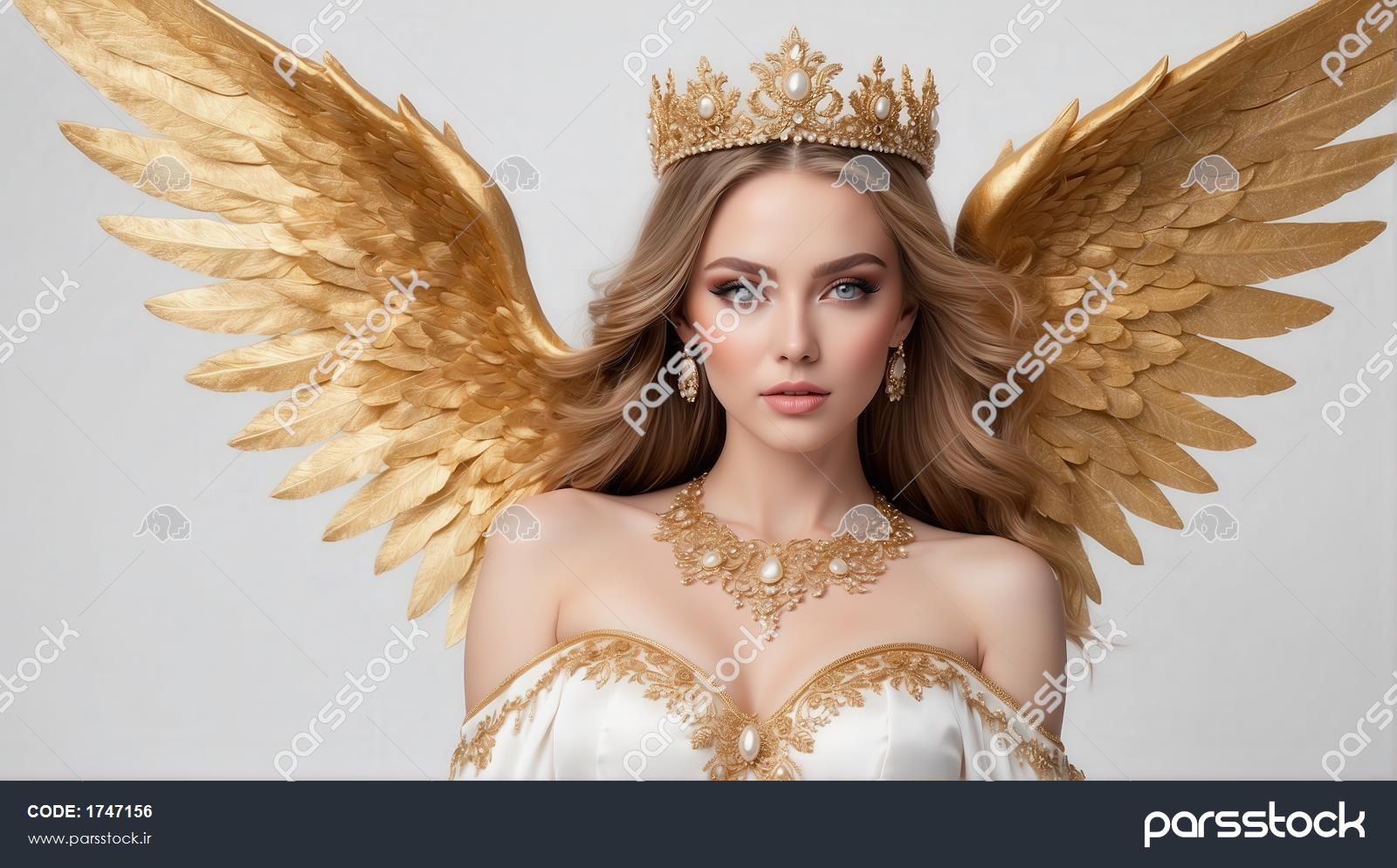 طرح زن بالدار با بال‌های طلایی و لباس مجلل سفید برای پوستر چاپی