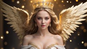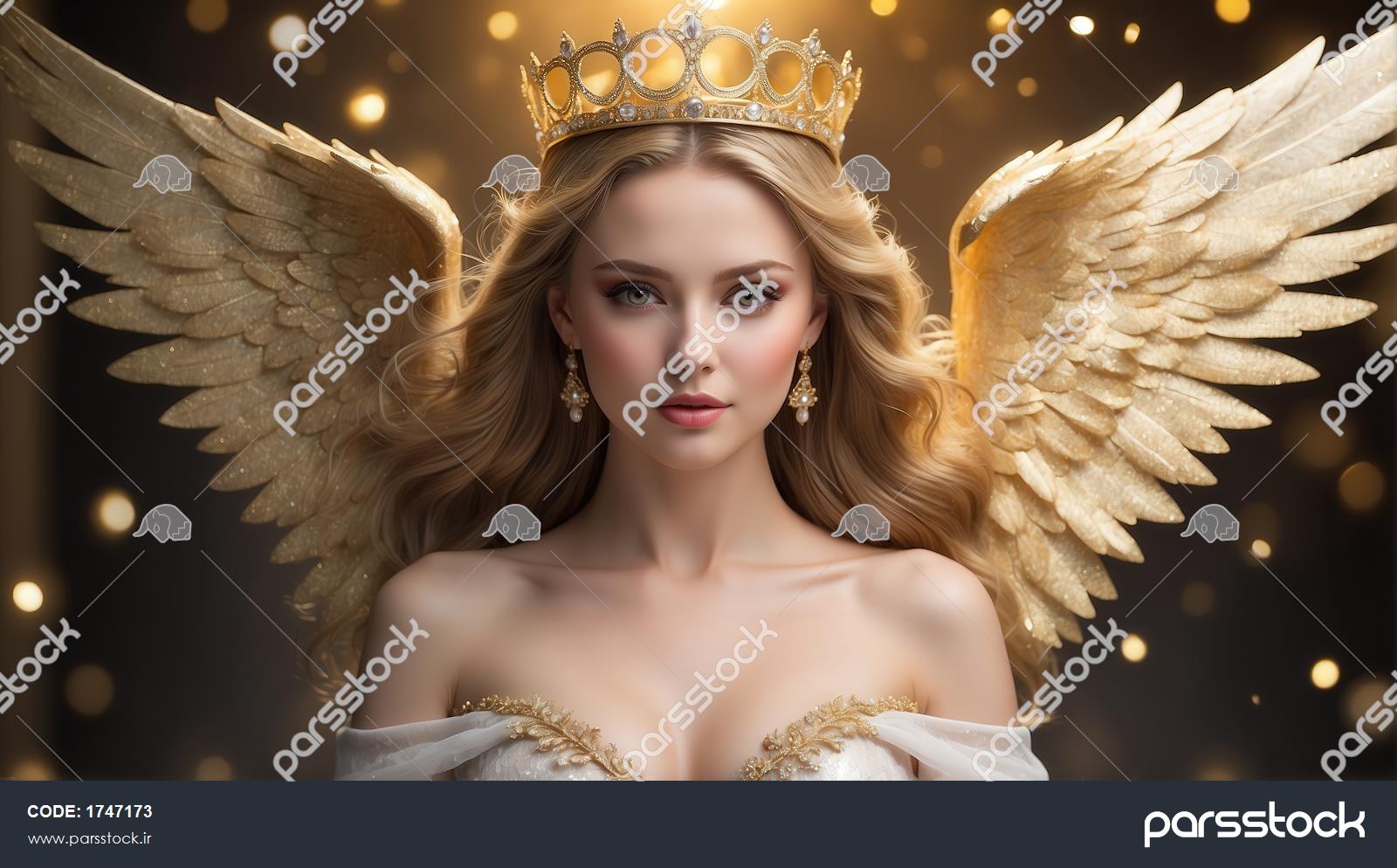 تصویر فرشته زن با بال‌های بزرگ طلایی و موی بلوند برای پوستر چاپی